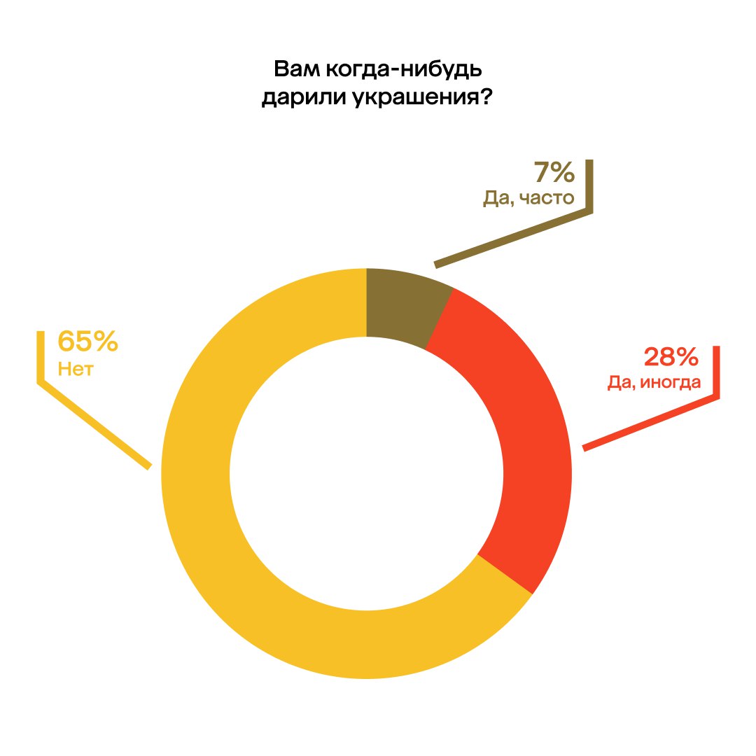 Большинство хотят получить украшения от любовного партнёра (53%), 35% – от родственника, 10% – от друзей, и только 2% россиян вообще без разницы, от кого получать ювелирку.