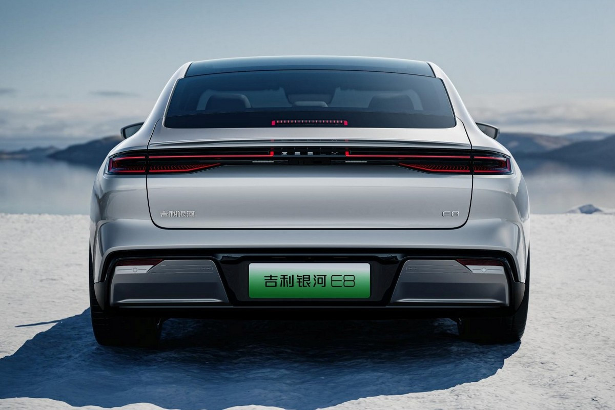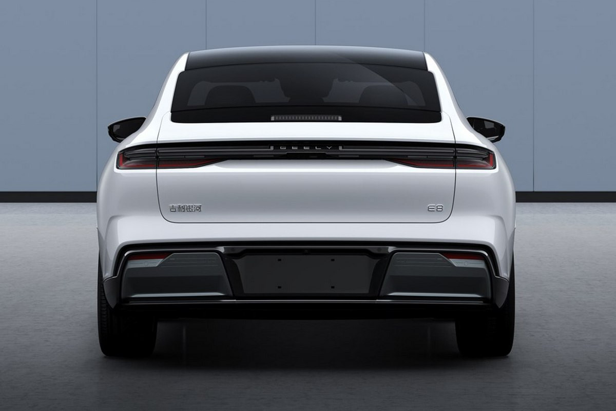 Флагман представляет собой электромобиль, он «вырос» из концепта Galaxy Light, который показали в рамках анонса новой линейки. От предвестника серийный седан унаследовал головную оптику необычной формы, агрессивный передний бампер, оформленные в виде единой плашки задние фонари, крупные колеса и безрамочные двери. Правда, у товарного Galaxy E8 двери, судя по всему, с классическими петлями: у шоу-кара передние открывались вверх, а задние распахивались против хода движения. Зато сохранили светящийся нос: в передний бампер встроено множество диодов, они могут приветствовать владельца электрокара или просто «переливаться».