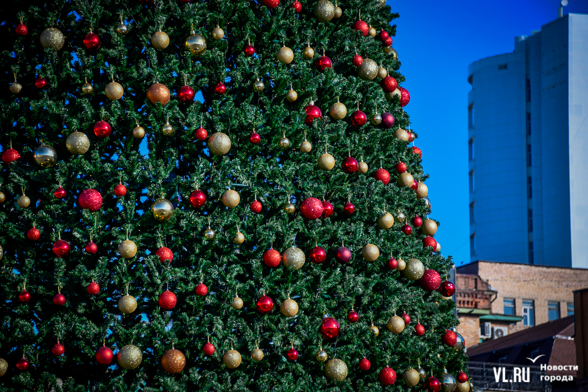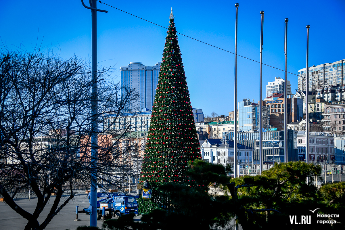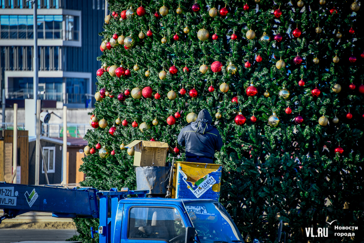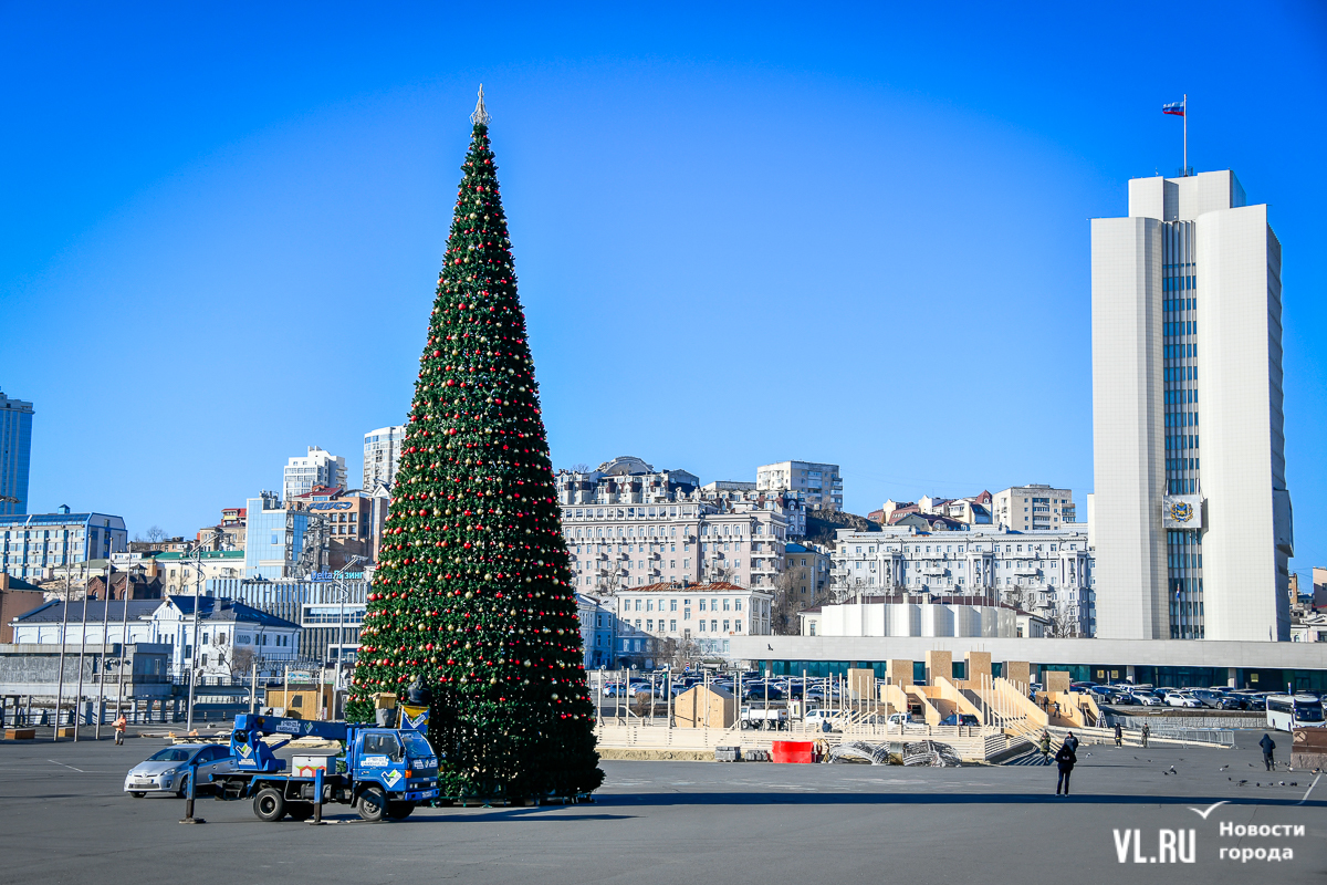 Рабочие почти закончили украшение большой ёлки на центральной площади Владивостока. Одновременно с этим продолжается строительство горки и катка – у подрядчика осталось на это чуть меньше двух недель. Торжественное открытие новогоднего городка состоится в среду, 25 декабря.