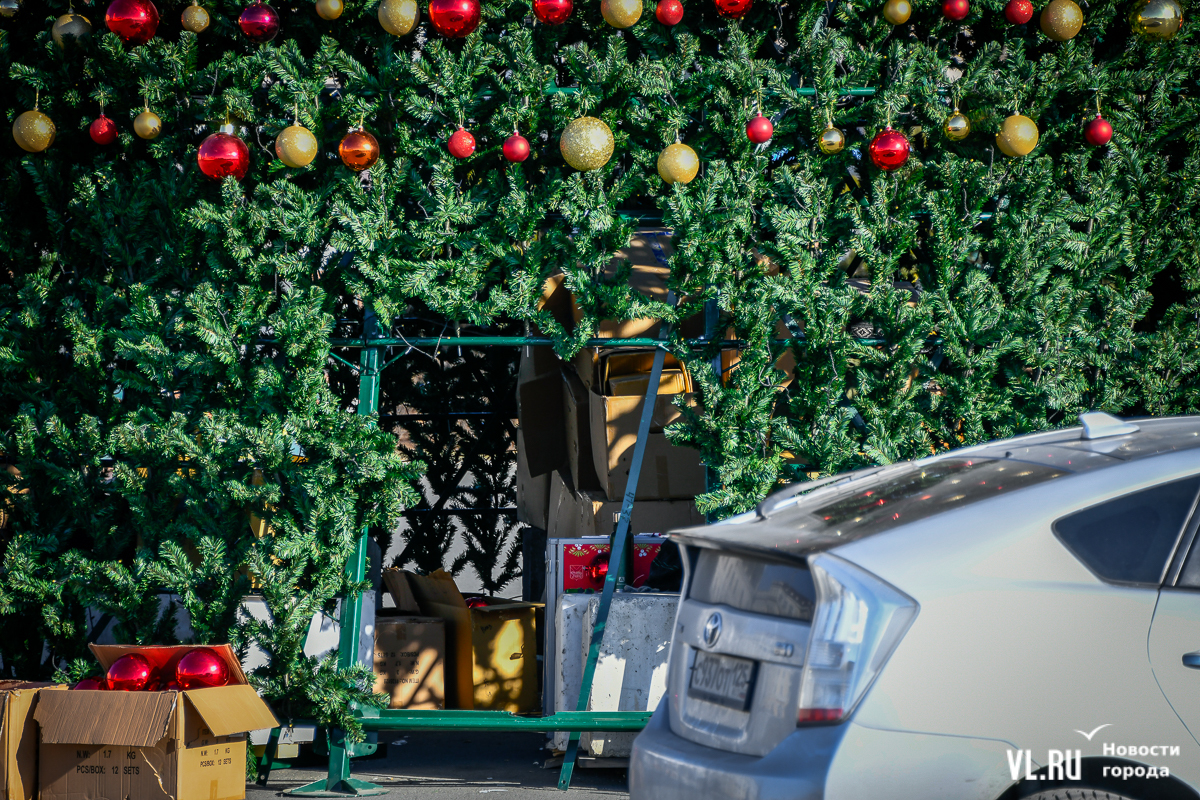 Эта 20-метровая искусственная каркасная световая ель сравнительно новая, впервые её стали использовать на главной площади города в прошлом году, закупил её Туристско-информационный центр Приморского края. Она на 8 метров ниже предыдущей, отслужившей до этого семь лет.