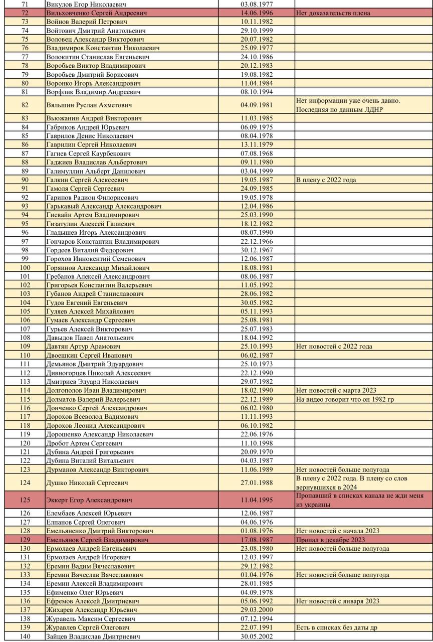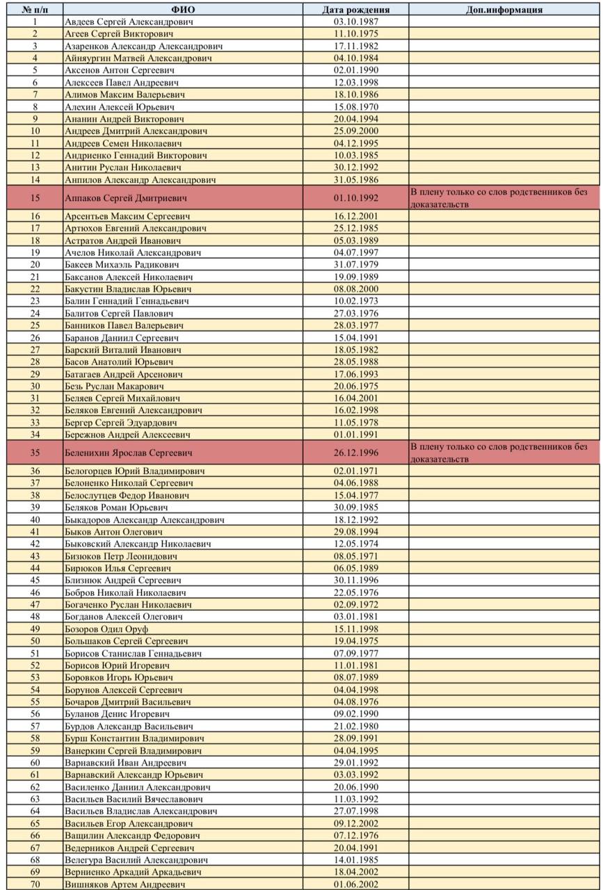 🟡 Желтым отмечены реальные пленные, которые звонят домой, о которых есть информация у МККК, о которых сообщали нам ребята, вернувшиеся в обменах, которых опознали по фото или видео.