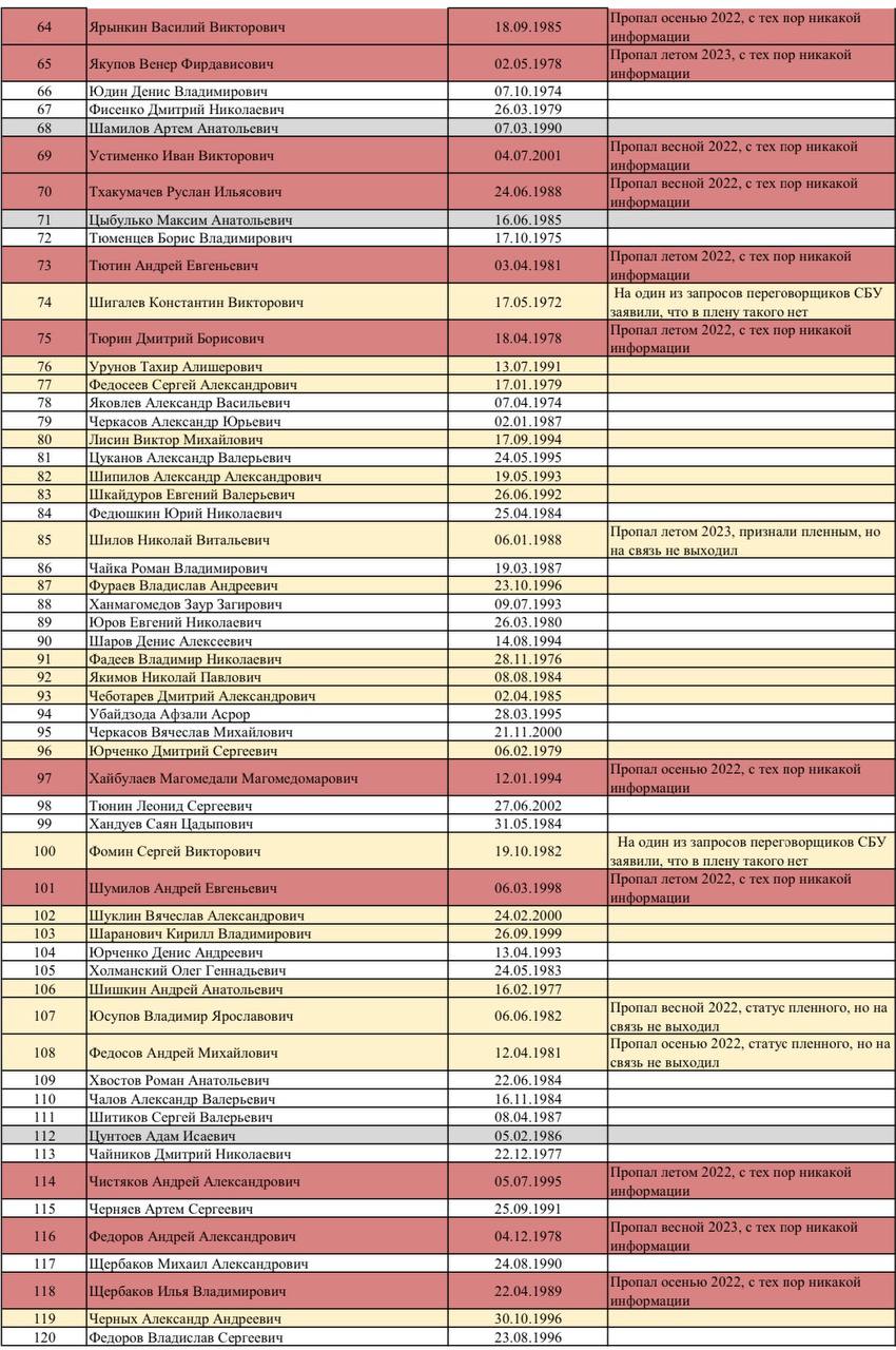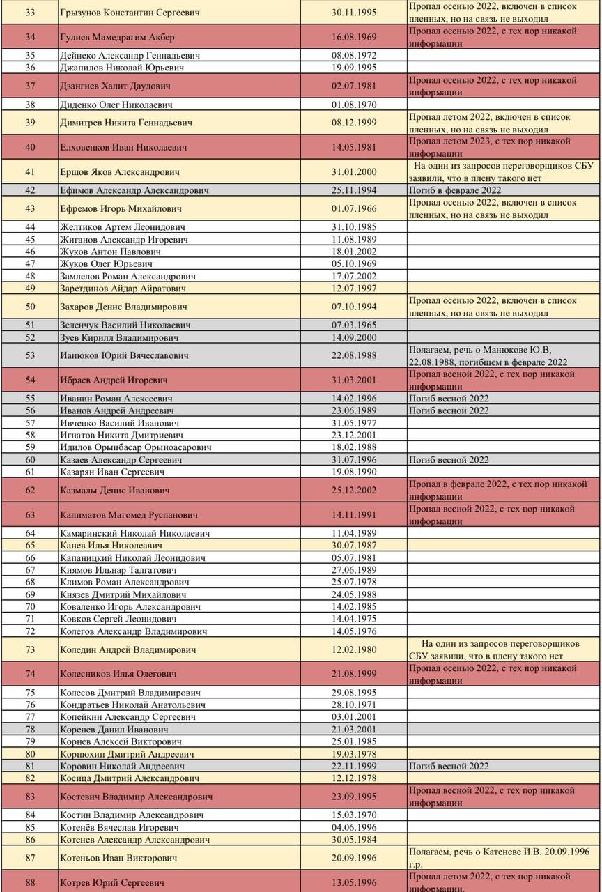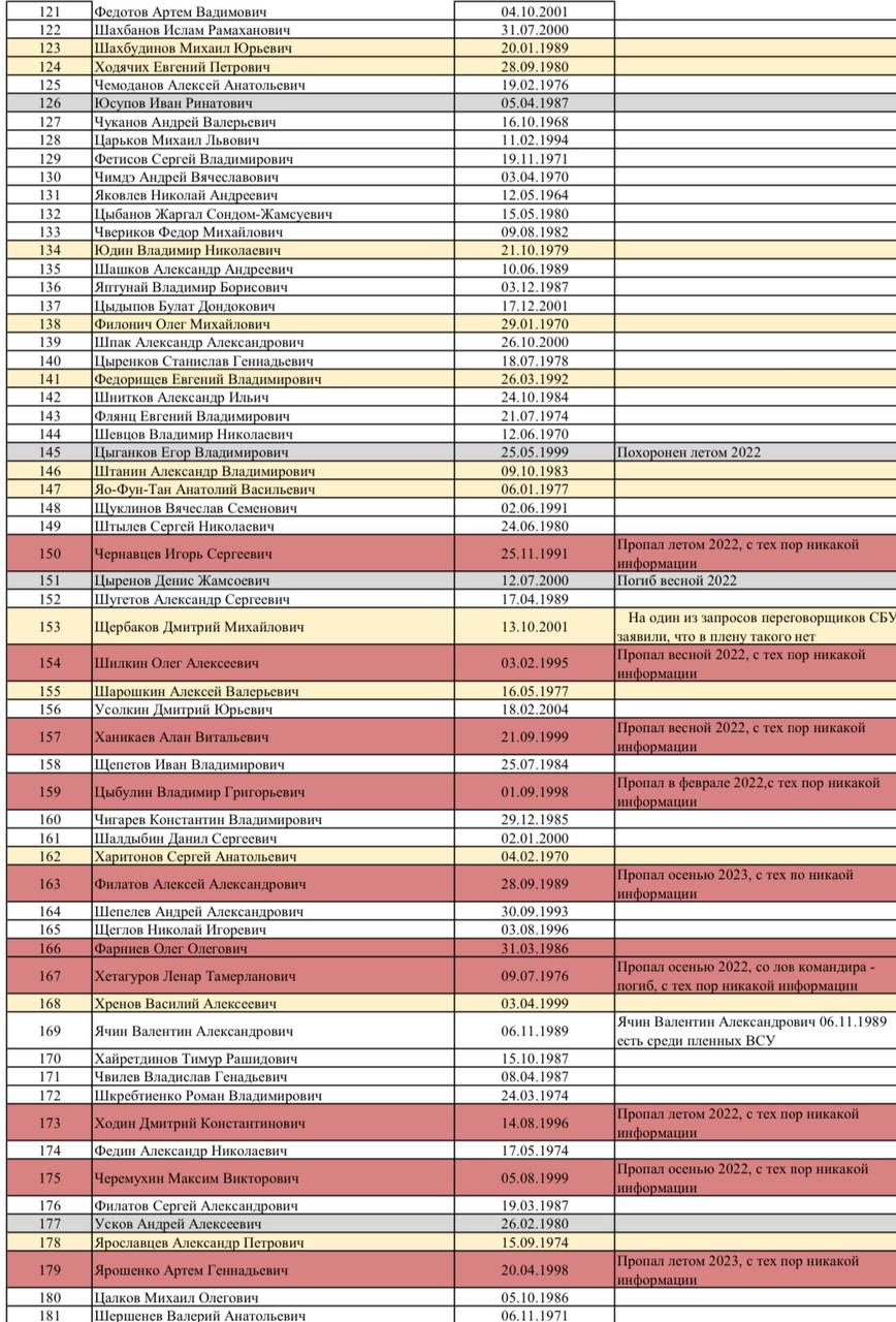 🔴 Красным - бойцы, которые пропали без вести (как правило, ещё в 2022 году), и о них с тех пор не поступало никакой информации.