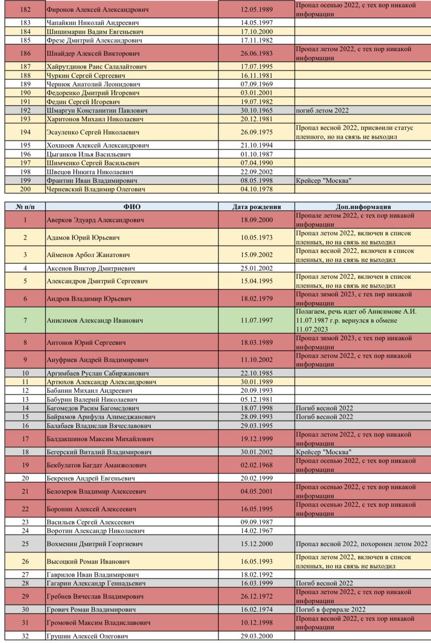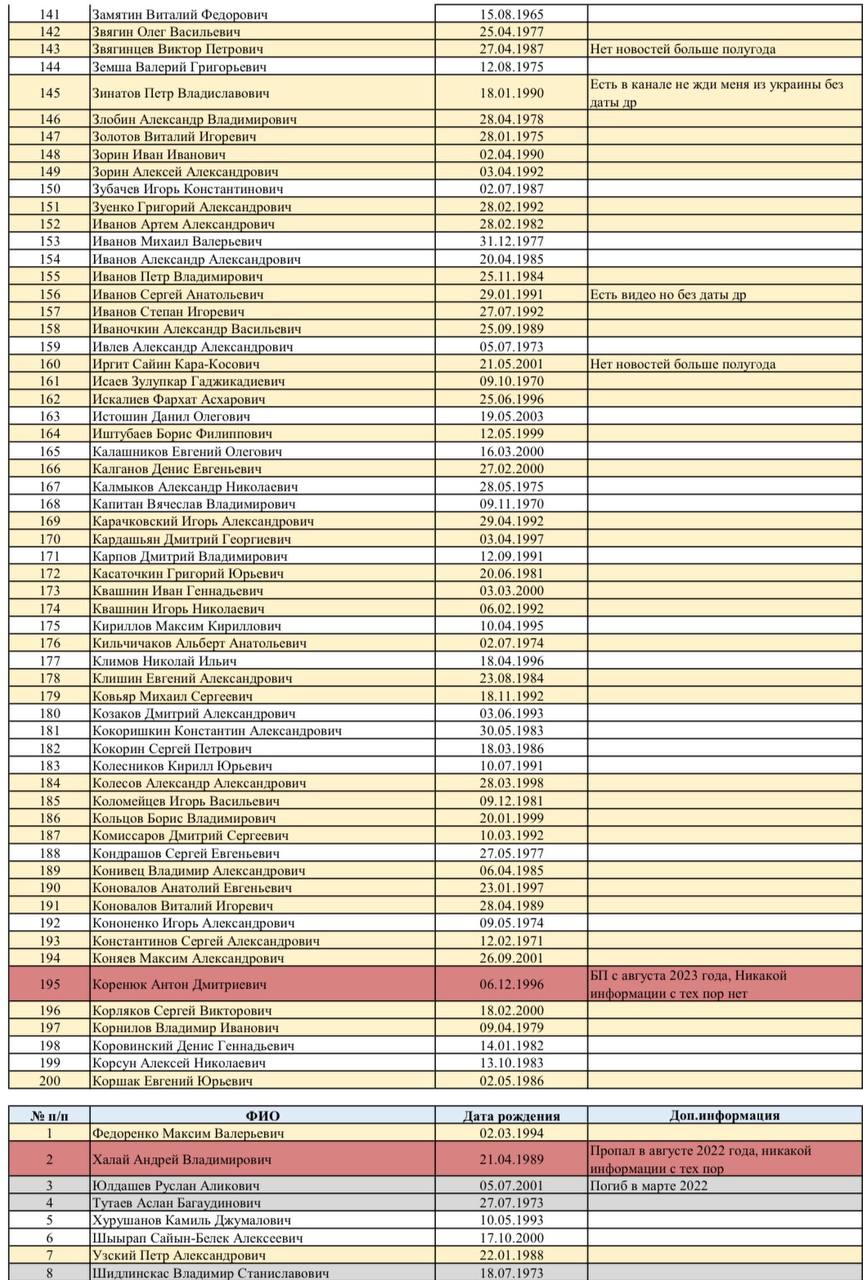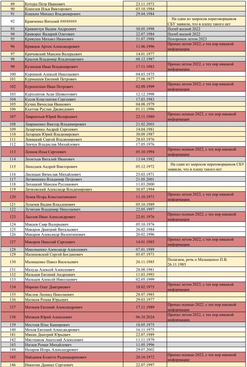 🔴 Красным - бойцы, которые пропали без вести (как правило, ещё в 2022 году), и о них с тех пор не поступало никакой информации.