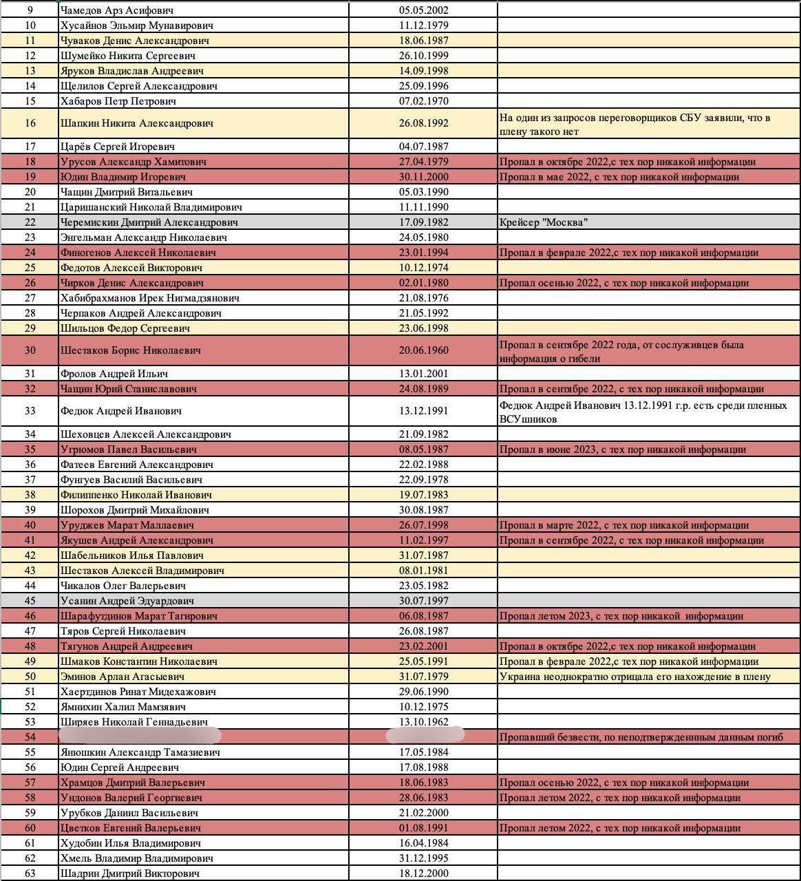 У нас нет доступа ни к каким базам МО, мы не знаем, какой боец в каком статусе числится официально. Но за полтора года работы с семьями участников СВО, мы собрали огромную базу пропавших, пленных и погибших. Туда мы добавляли ребят по информации, предоставленной их родными. Кроме того, мы пользовались возможностями интернета, искали упоминания в СМИ и социальных сетях. Выкладываем первую часть.