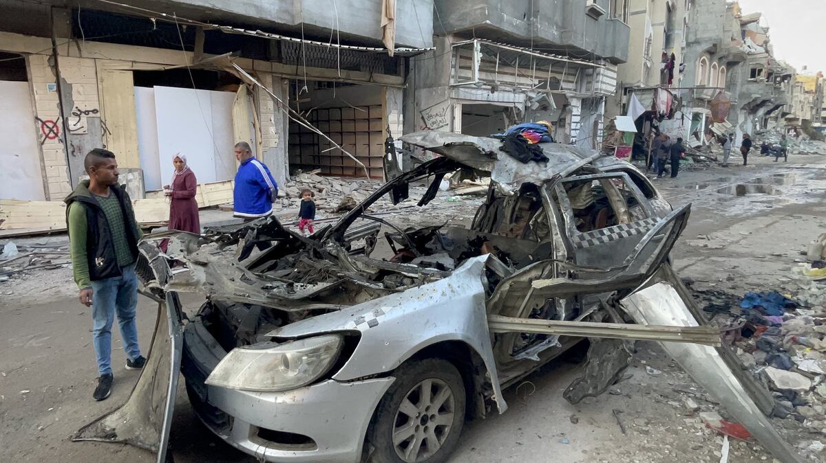 Un hombre señala una calle llena de escombros y los edificios destruidos que la flanquean, este domingo en Jan Yunis, al sur de la franja de Gaza. / AHMED ZAKOT / REUTERS