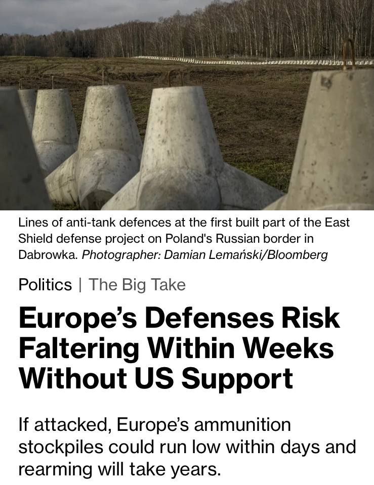 По данным Bloomberg, в случае атаки запасы боеприпасов в Европе будут истощены в течение нескольких дней, а перевооружение займет годы.