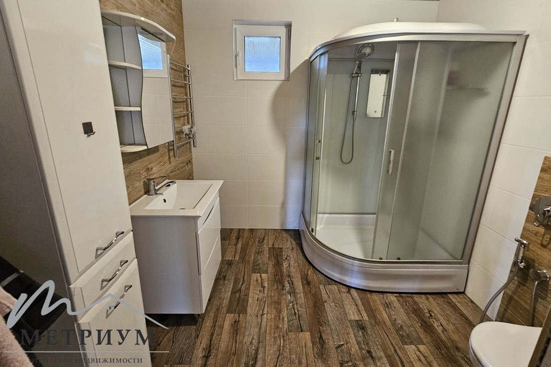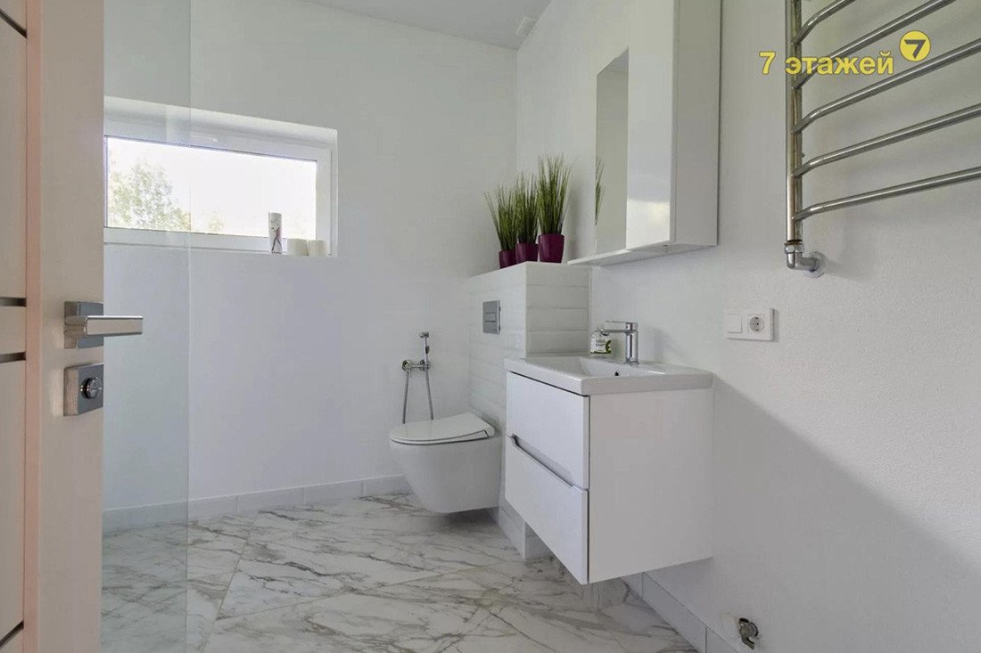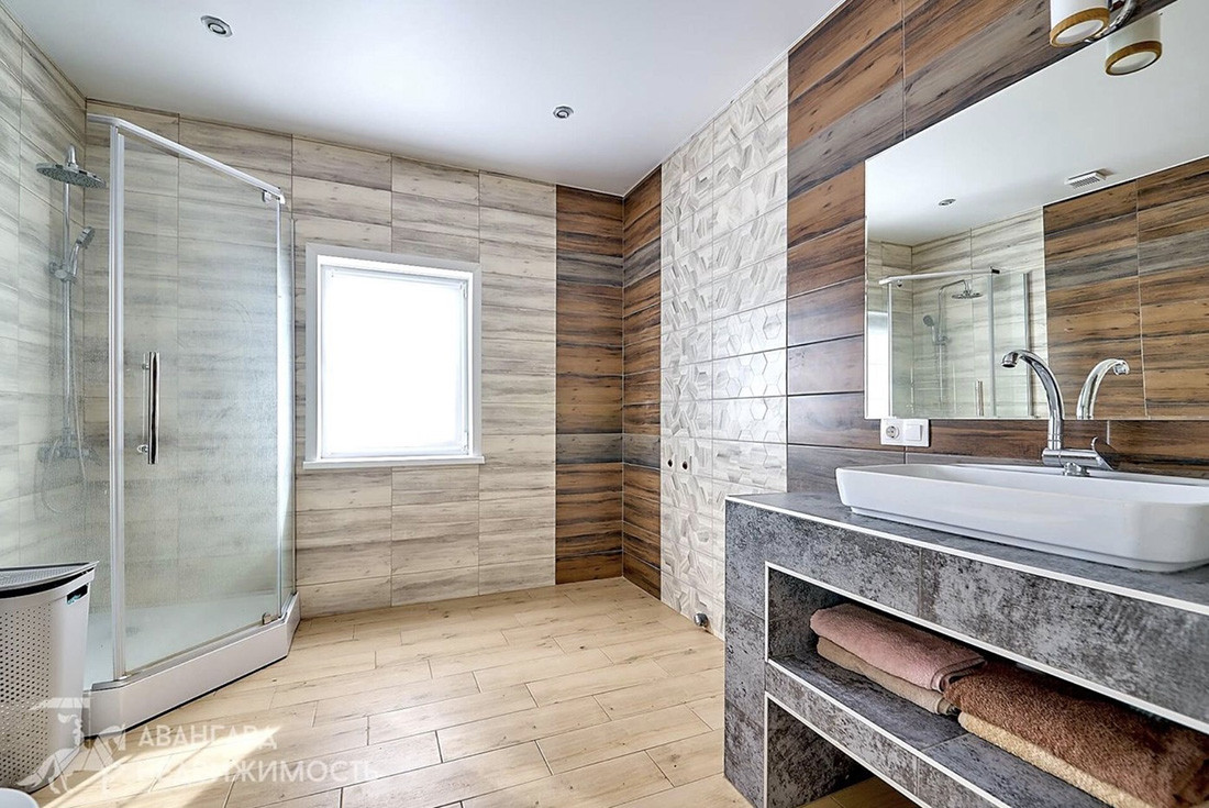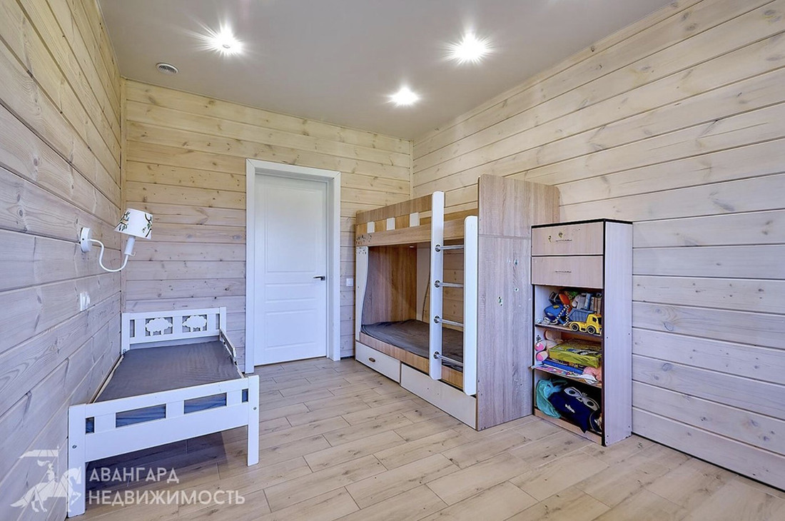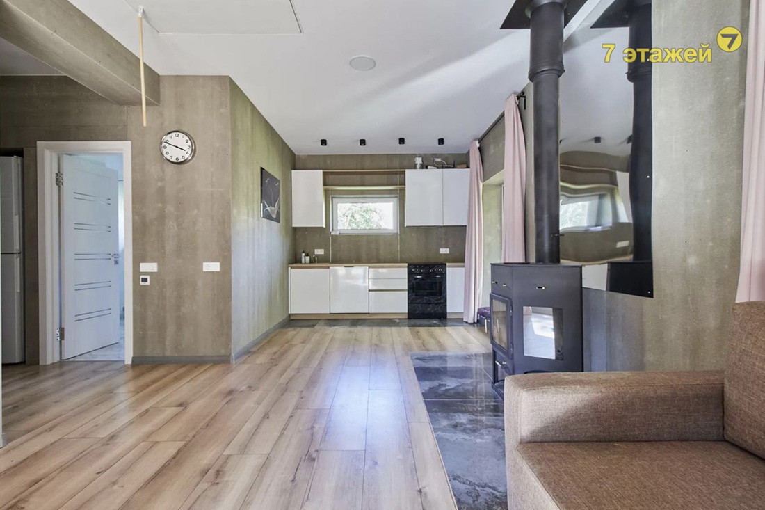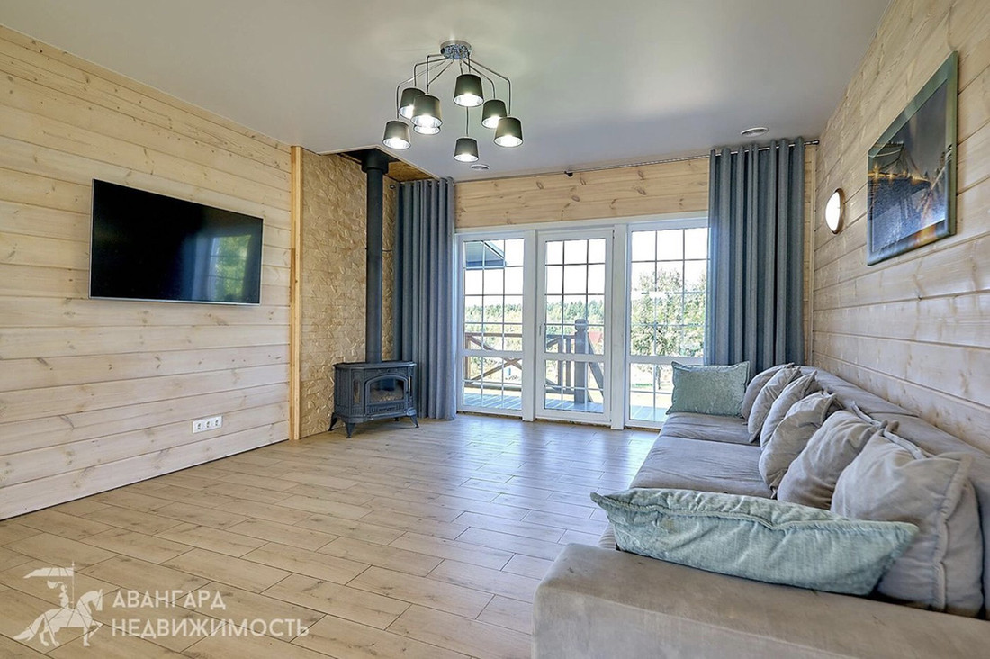 Дом с ремонтом, можно заезжать и жить. На полу керамогранит с водным подогревом — холодно не будет. Стены обшиты сосной. Санузел облицован плиткой, подводка для стиральной машинки и биде уже проложена. Двухкамерные энергосберегающие стеклопакеты сохраняют тепло и не пропускают шум. В гостиной установлена печь-камин, которая поможет согреться в прохладный вечер.