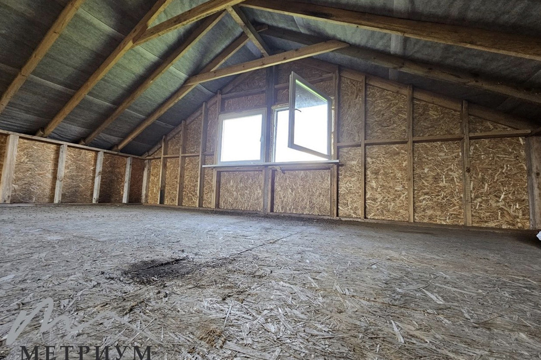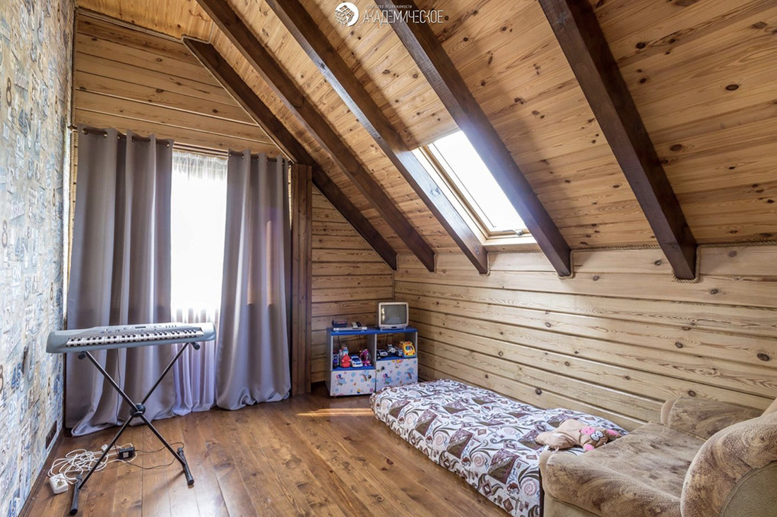 На втором этаже две спальни по 12,5 «квадрата» и шикарная жилая комната на 26 метров с балконом. Своего санузла нет, что не очень удобно. В помещениях помимо обычных окон есть и мансардные. Света хватает даже в коридоре. Ремонт в доме выполнен, но кое-каких элементов (например, межкомнатных дверей) пока не хватает. Задача передается по наследству новым хозяевам. Как и обустройство полноценной кухни.