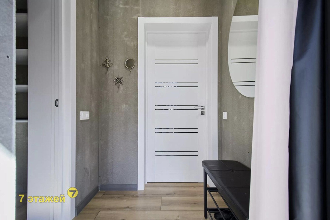 Ремонт достаточно брутальный: стены под бетон и много ламината. Смягчают картину вкрапления пудрового цвета. Состоит дом из просторной кухни-гостиной, одной спальни, гардеробной и санузла. Идеально для молодой семьи.