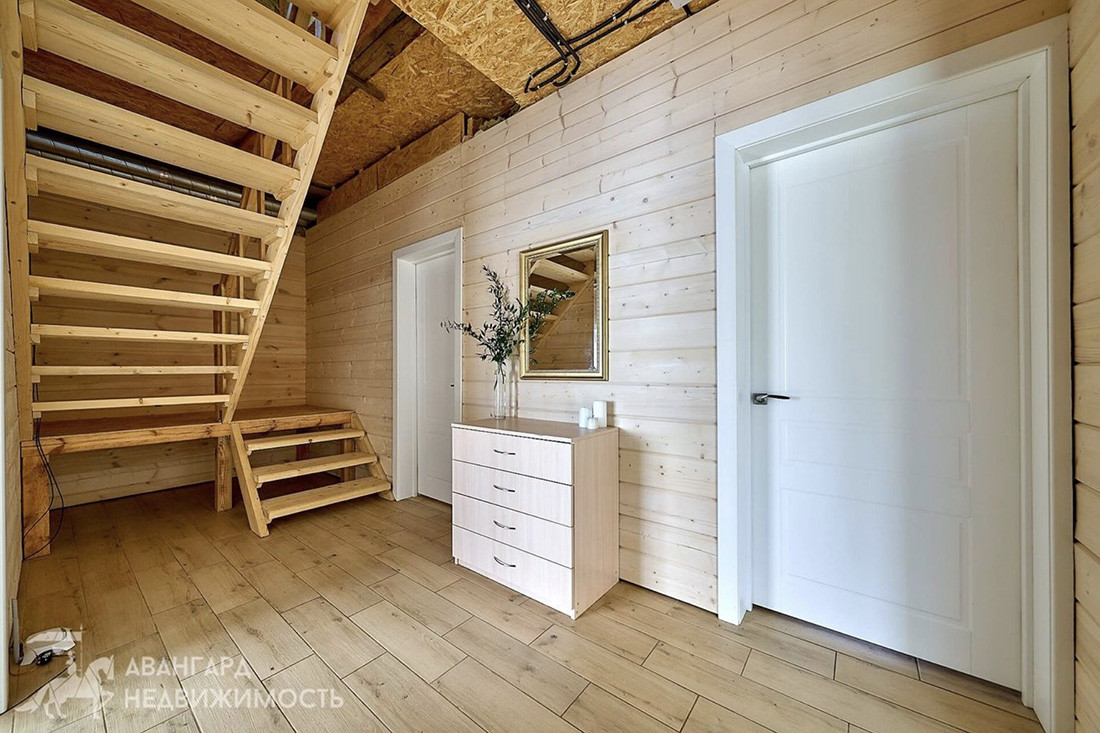 Профилированный брус правит бал не только снаружи, но и внутри. Хозяева не стали его зашивать, только покрыли пропитками, а еще в санузле уложили плитку (но тут по-другому никак). «Пройдемся» по этажам. На первом уровне видим 22-метровую кухню, отдельную 20-метровую гостиную, жилую комнату на 10 «квадратов» (можно использовать как гостевую спальню или кабинет). На месте санузел и топочная с отдельным входом.