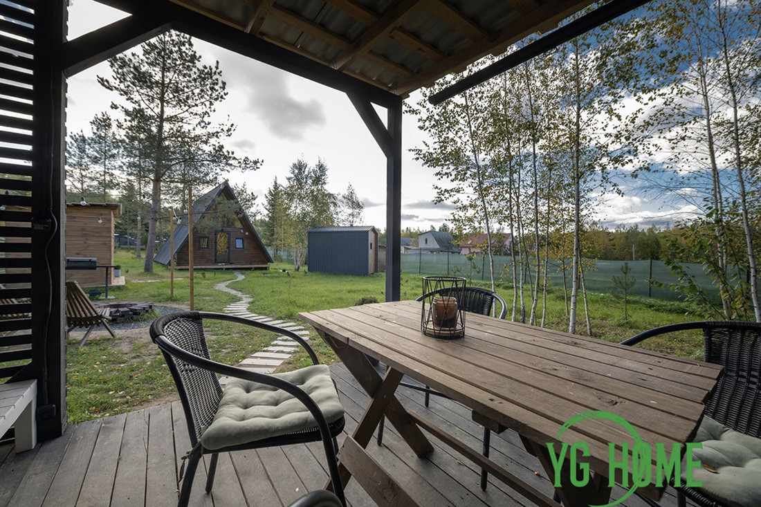 Этот дом — просто рай для визуалов. Окна, терраса, перила — все словно по канонам легкого кантри. Уже представили, как пьете чай летним вечером под навесом? Мы тоже. Поэтому вперед — изучать, из чего состоит этот каркасник, выросший в 2019 году в СТ «Милаши» (Путчинский сельсовет).