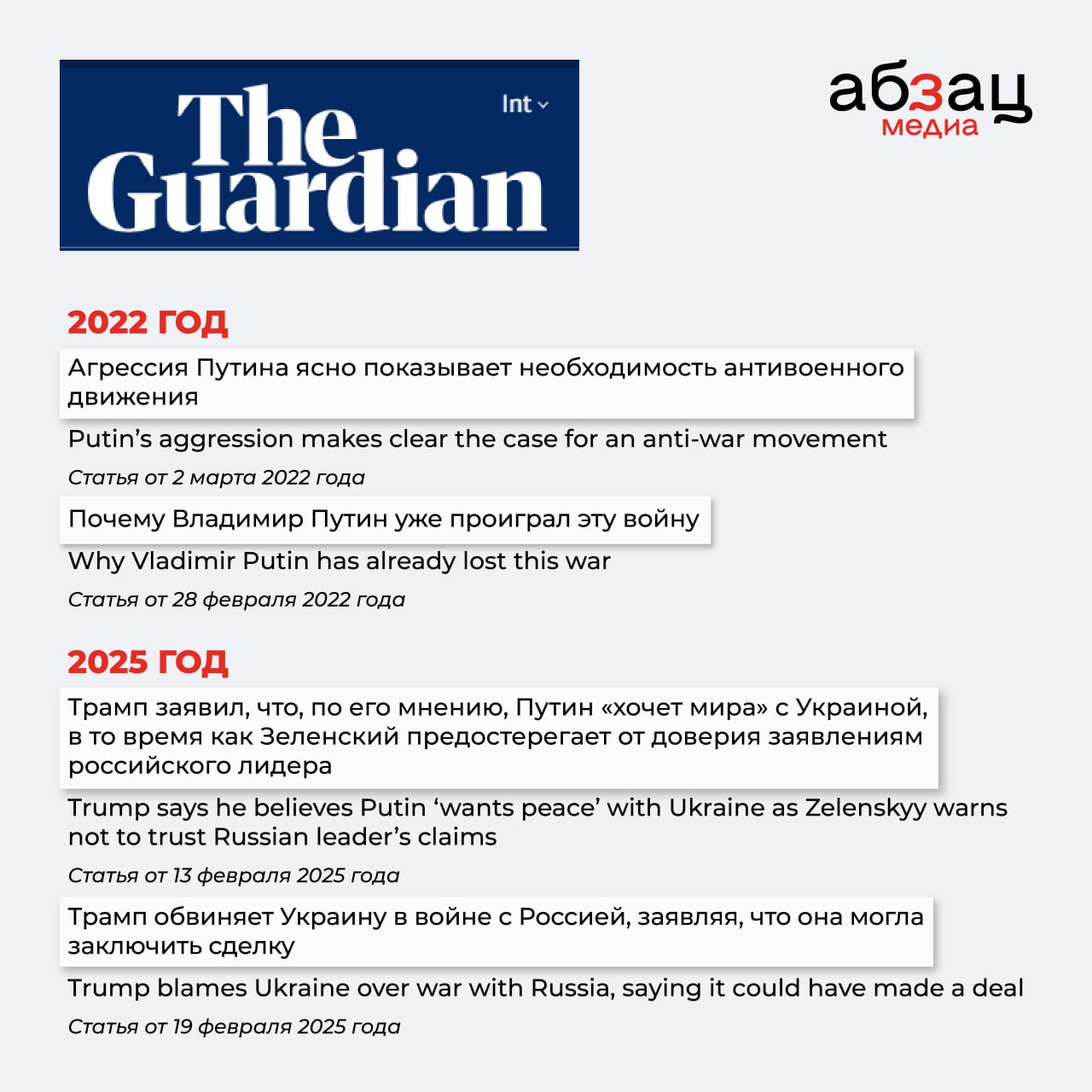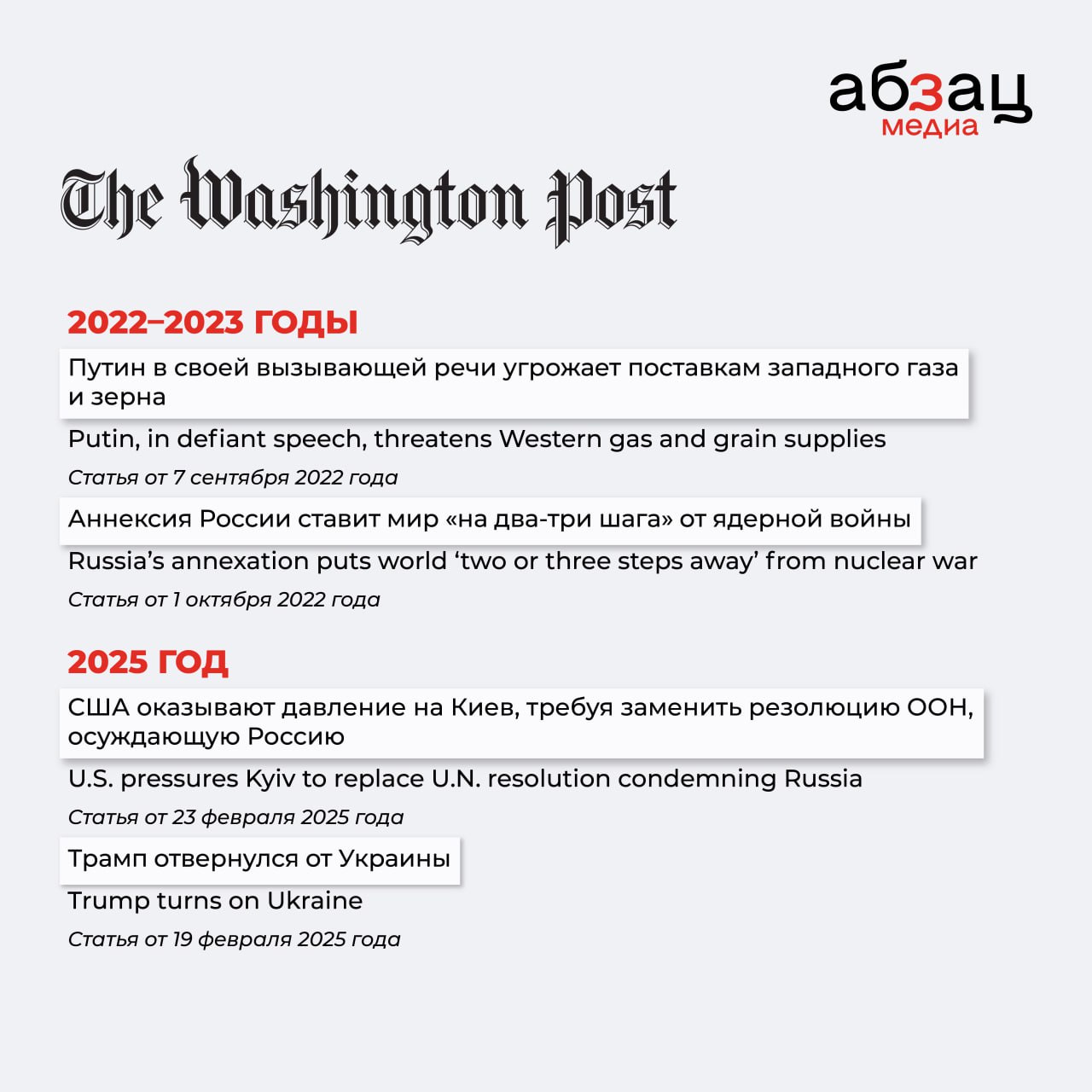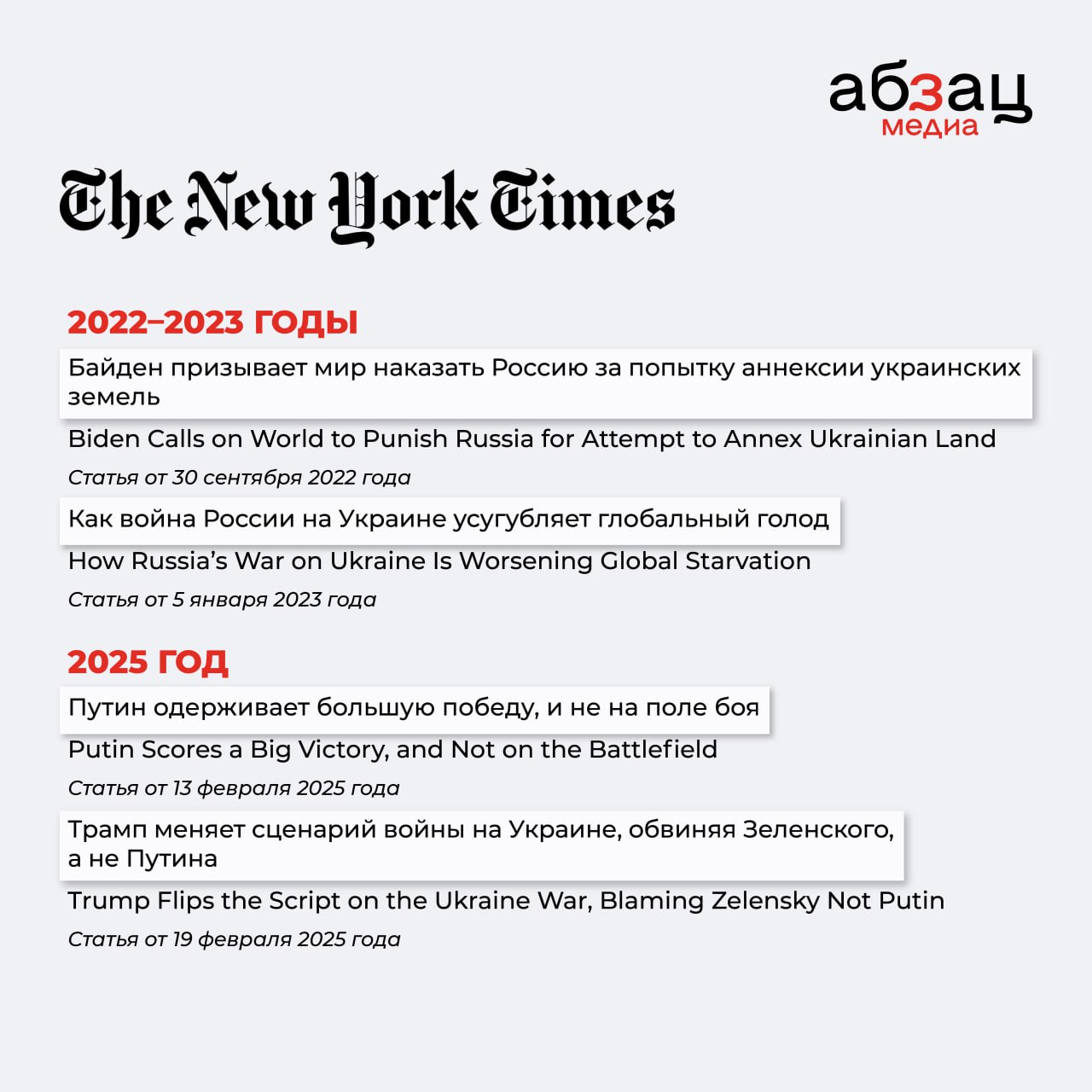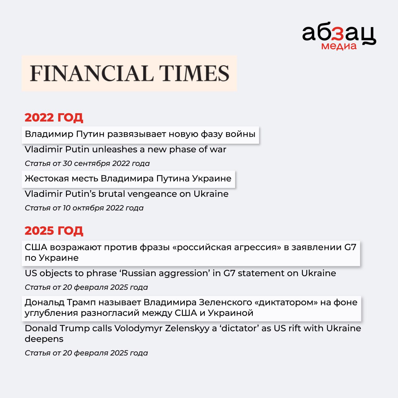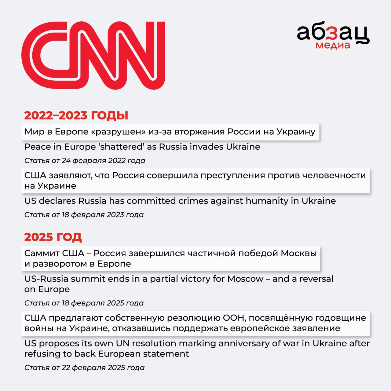 Очень хорошо это можно понаблюдать, сравнивая заголовки в СМИ 2022–2023 годов и начала 2025-го. Собрали на карточках самые забавные метаморфозы таких СМИ, как CNN, Financial Times, The New York Times и других.