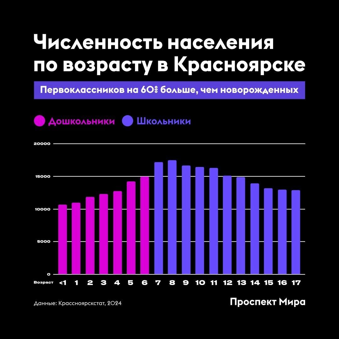 Так, по данным на конец 2023 года (более свежих данных нет), в Красноярске было 10,7 тысячи детей до 1 года, а детей, которые пошли в школу (7-летние), было в 1,6 раза больше — 17,2 тысячи. Проще говоря, если сейчас в школу, например, идут 17 первых классов, то через семь лет будет 10 первых классов.