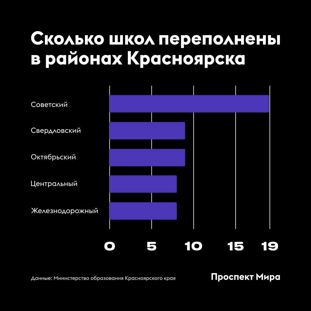 В ведомстве указывают, что наиболее острый вопрос с этим наблюдается в Красноярске — переполнены 53 учреждения. Больше всего не хватает школ в Советском районе — он же самый крупный.