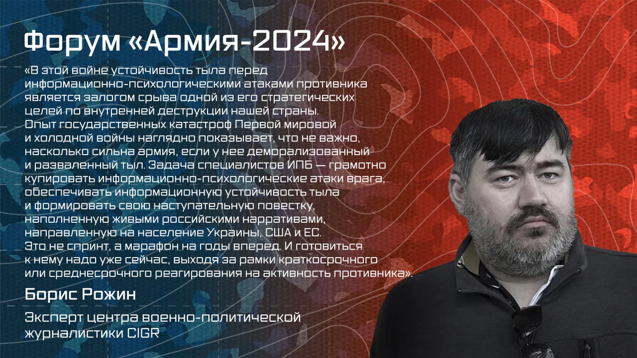14 числа буду на "Армия 2024" на круглом столе посвященном вопросам информационно-психологической войны. Для канала поснимаю всякого интересного с форума. В этом году он проходит в сжатом режиме при повышенных мерах безопасности. Изменения после смены руководства министерства обороны и известных уголовных дел - более чем серьезные (формат, сроки, доступность, безопасность - все поменялось).