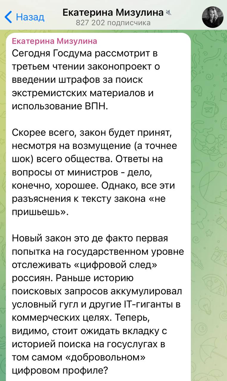 Екатерина Мизулина снова раскритиковала закон о штрафах за поиск экстремистского контента в интернете. Она назвала инициативу тотальной слежкой за всеми россиянами. Мизулина уверена, что из-за размытых формулировок под удар попадут все, даже жены депутатов. Кроме того, глава «Лиги безопасного интернета» считает, что новый закон вызовет новую волну мошенничества, так как шантажировать можно будет кого угодно.