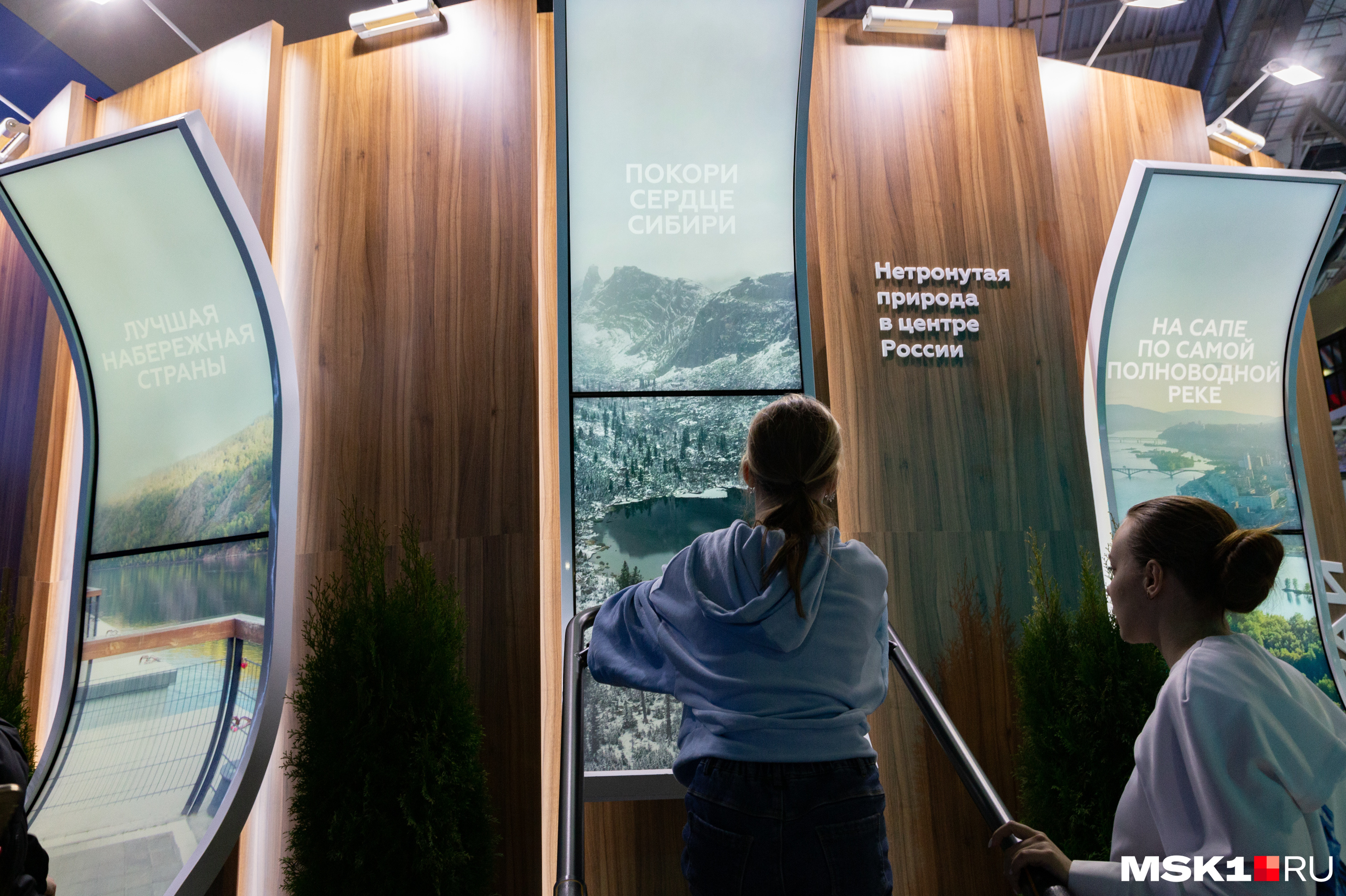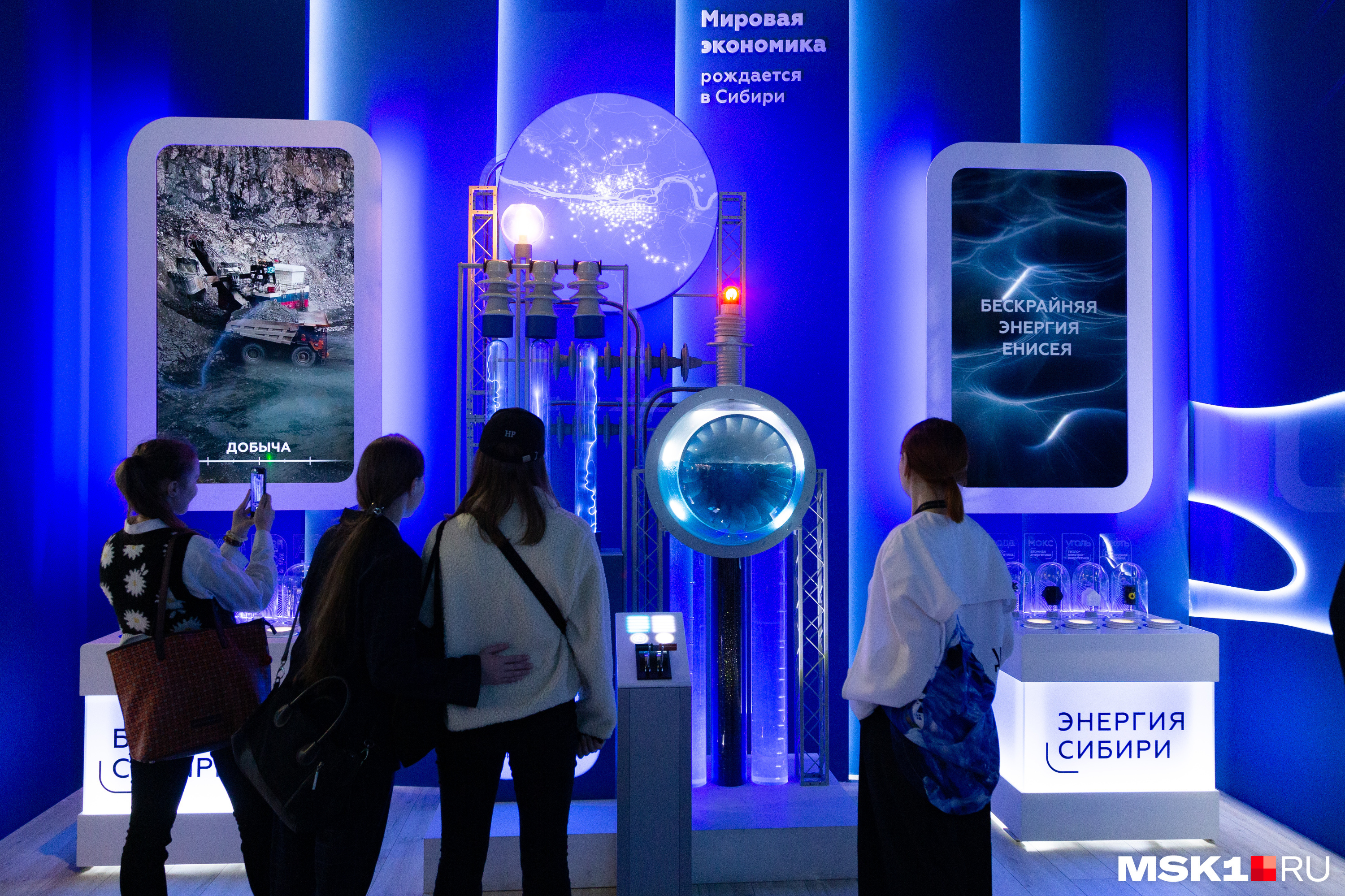 По бокам от Енисея и макета города расположились стенды с информацией об экономике региона (ГЭС, металлы, энергетика) и площадки, где можно виртуально попутешествовать по знаковым местам края.