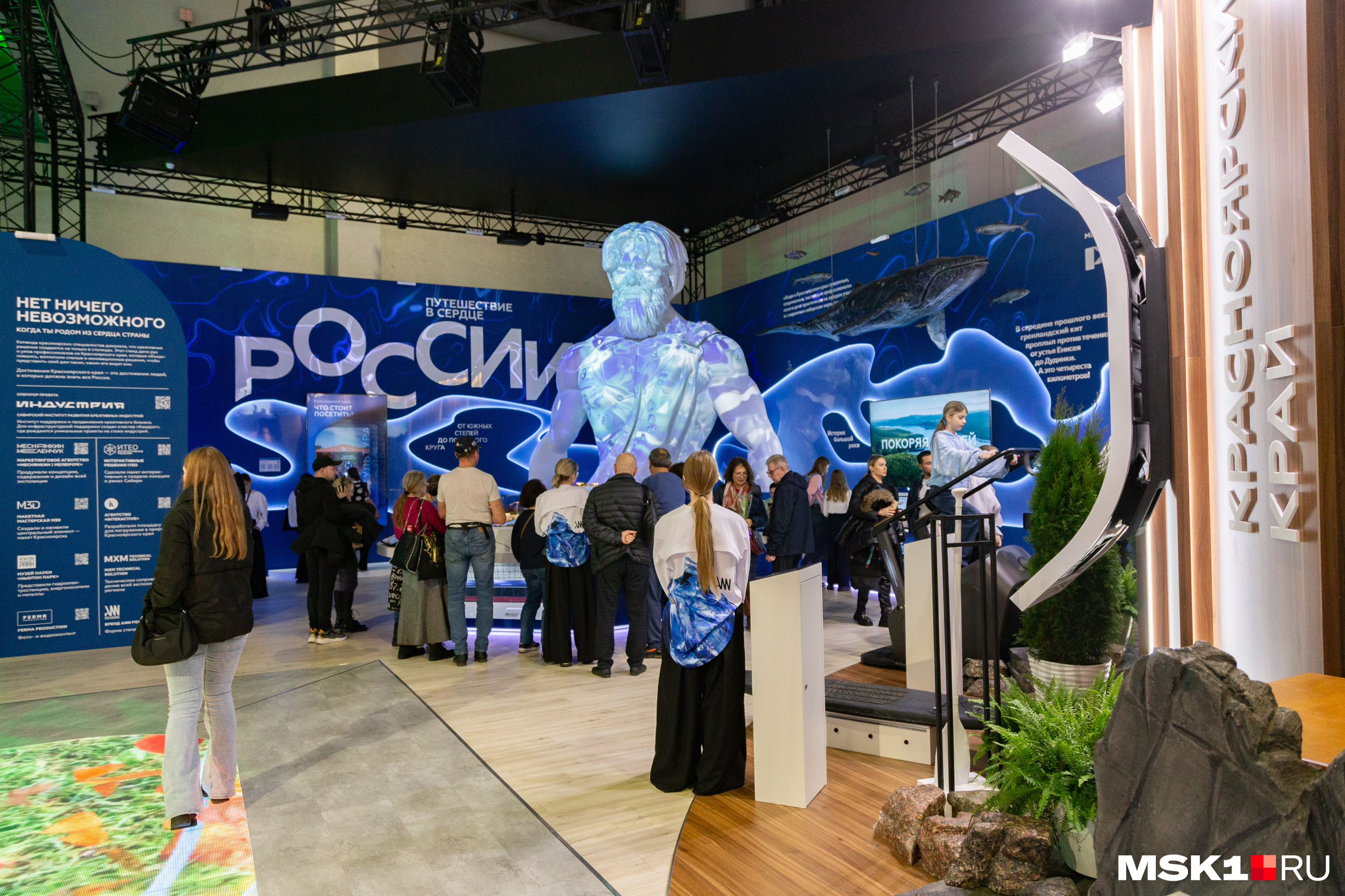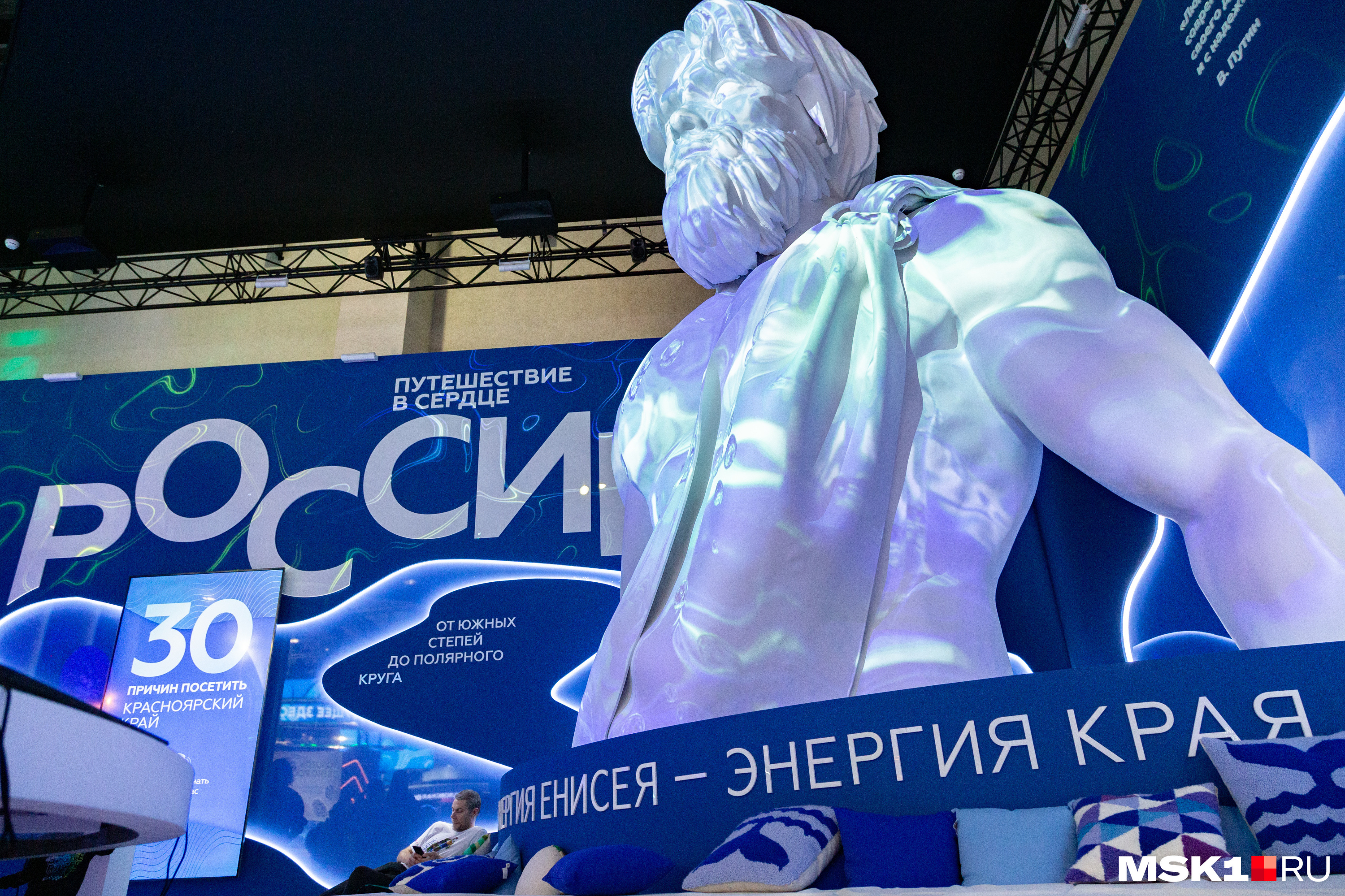 Белая пятиметровая скульптура величественно и почти грозно возвышается над посетителями стенда Красноярского края на выставке «Россия». Фигура бородатого мужчины со славянским или скандинавским лицом и в древнеримской тоге символизирует реку Енисей и неуловимо напоминает Посейдона или Нептуна. Позади его плавают рыбы и кит (насчет кита, может, и хотелось бы поиронизировать, но минимум один и правда заплывал на север реки где-то в середине прошлого века и погиб в районе Дудинки).