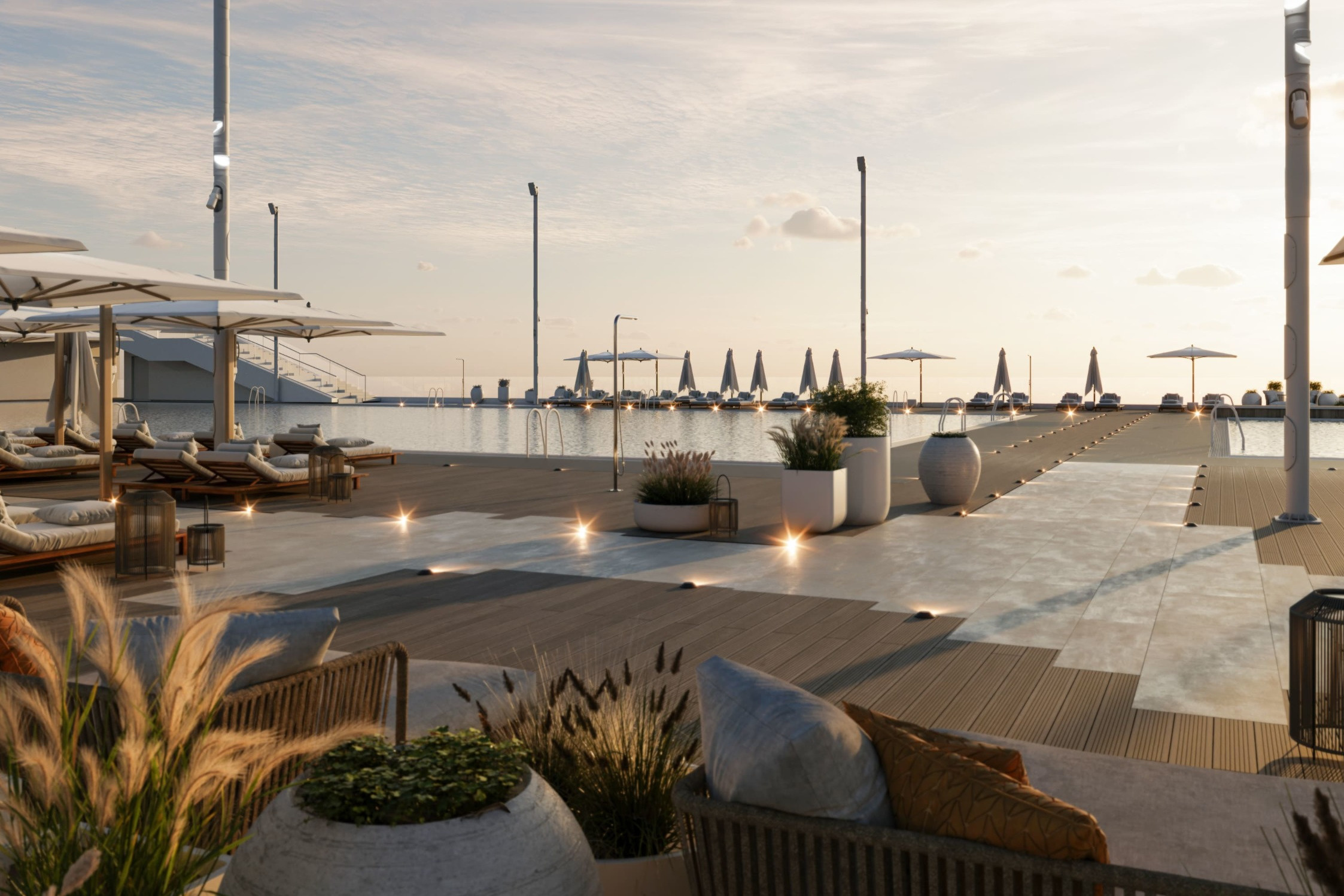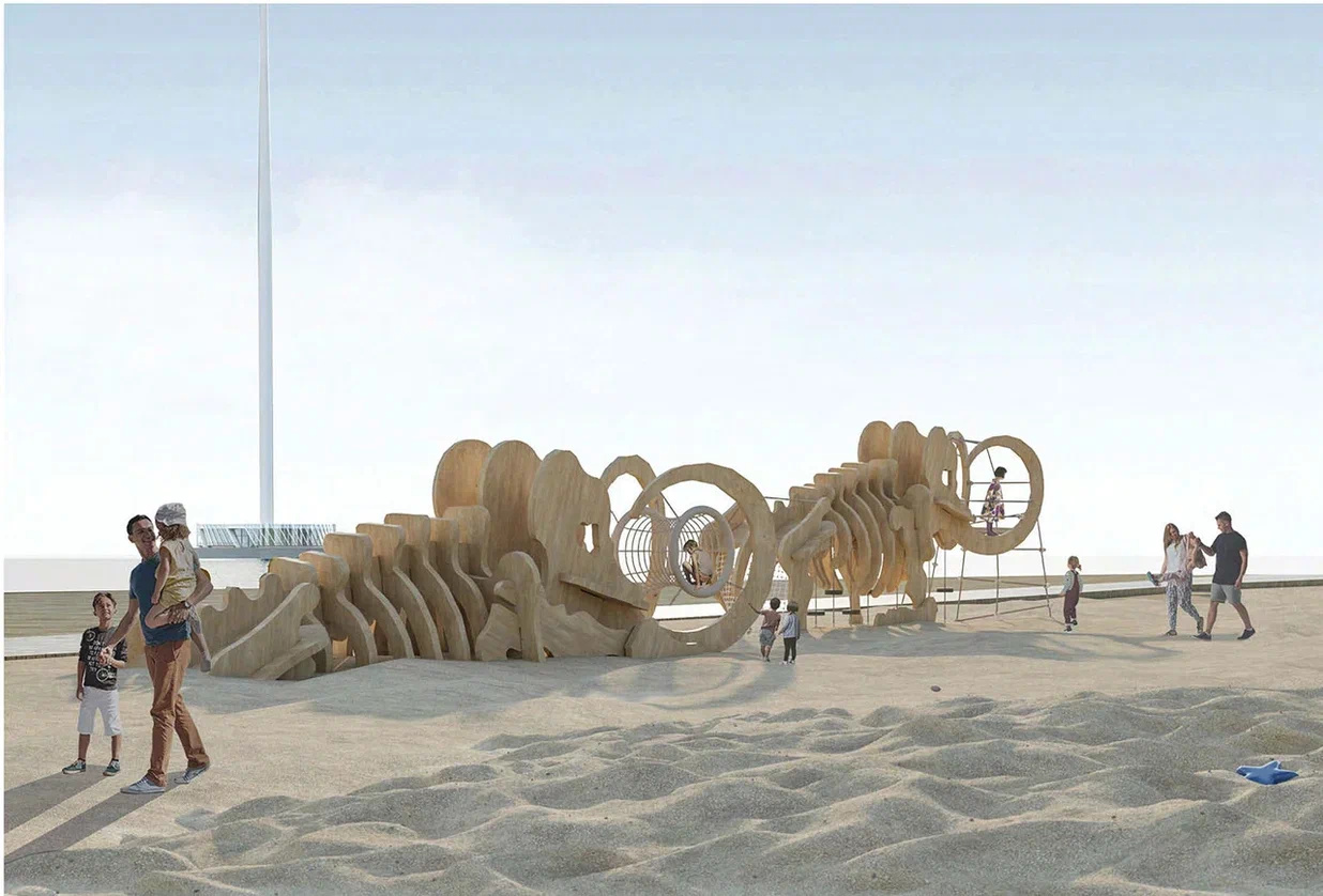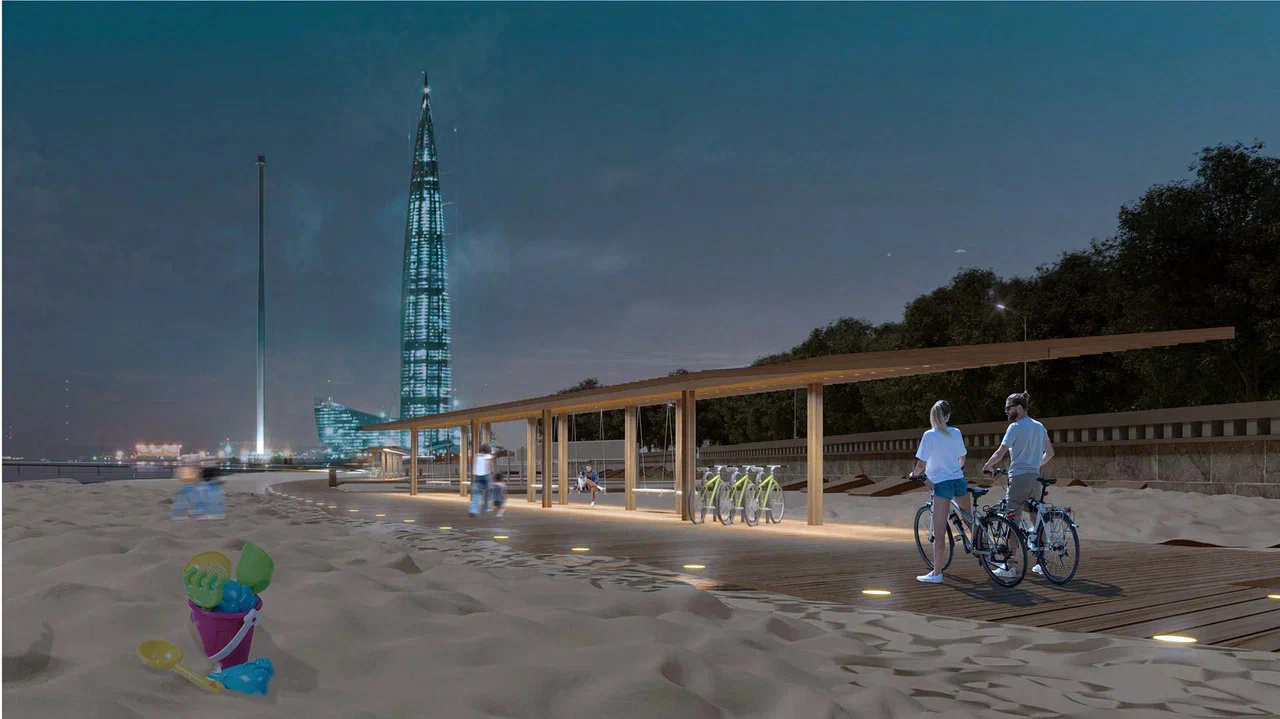 Здесь планируют разместить навесы, качели, столики с зонтиками, детское игровое оборудование, лежаки и кабинки для переодевания, а также обустроить газоны и прогулочные дорожки.