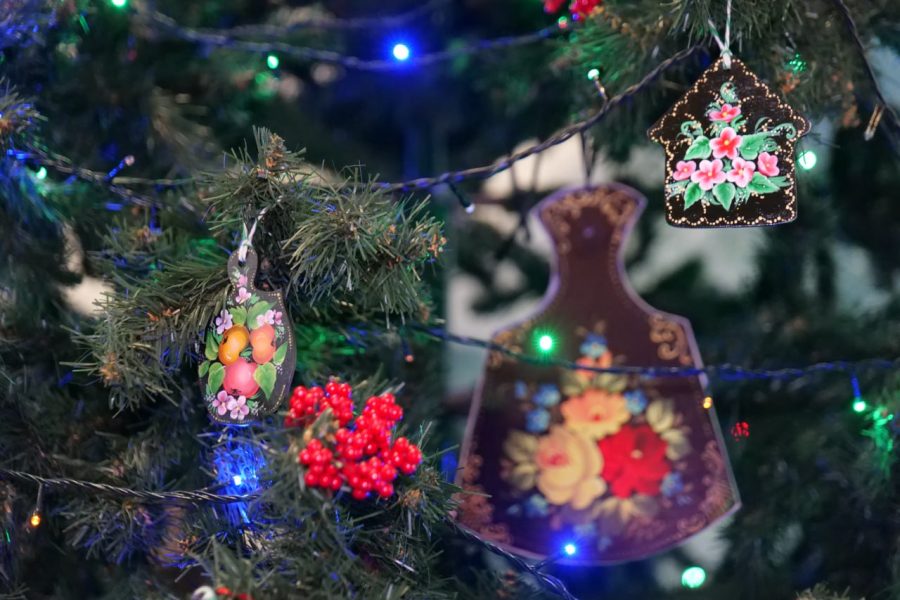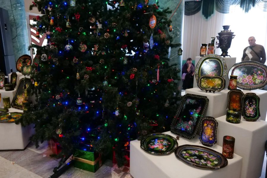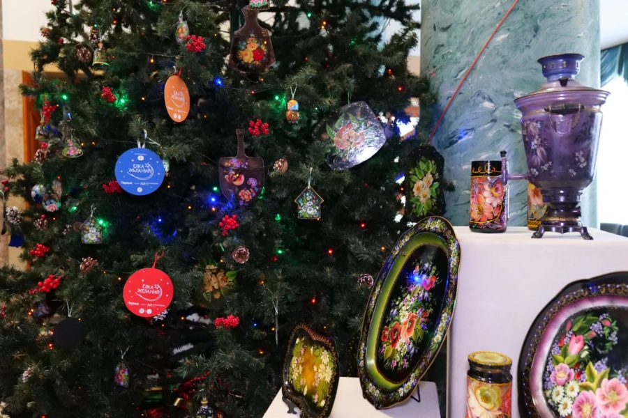 Конкурсное новогоднее дерево украсили эксклюзивными деревянными игрушками: матрешками, колокольчиками, домиками, шарами, выполненными в технике кемеровской росписи. Особенность этой росписи — двухцветный мазок на черном фоне, символизирующем угледобывающий Кузбасс.