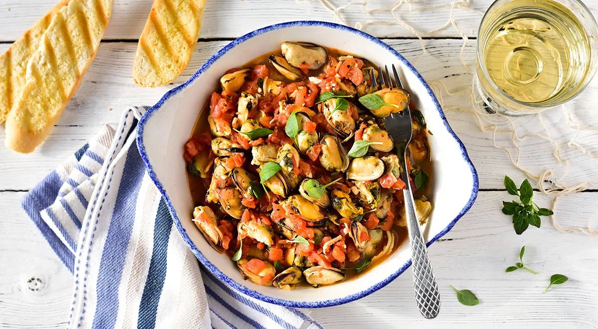 5. Перед подачей посыпьте тушёные мидии раскрошенной фетой и рубленой зеленью.