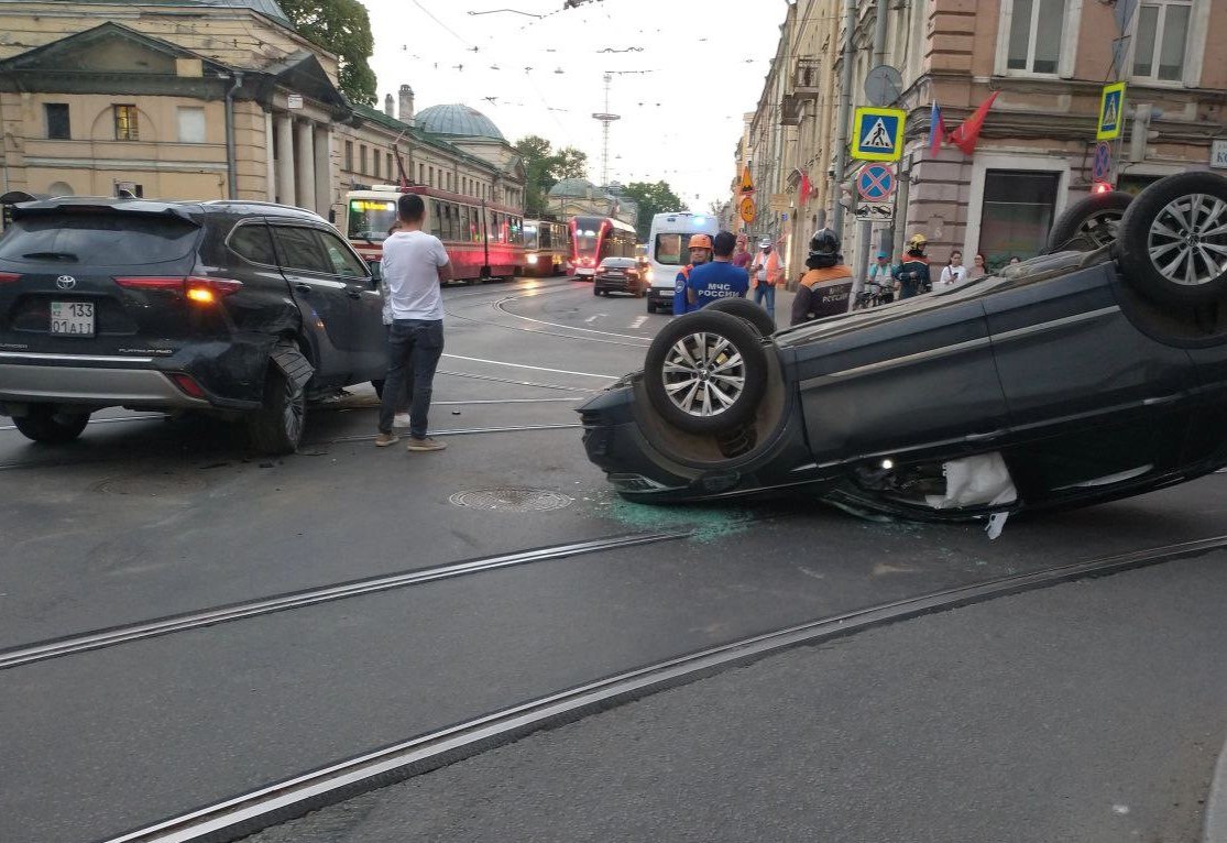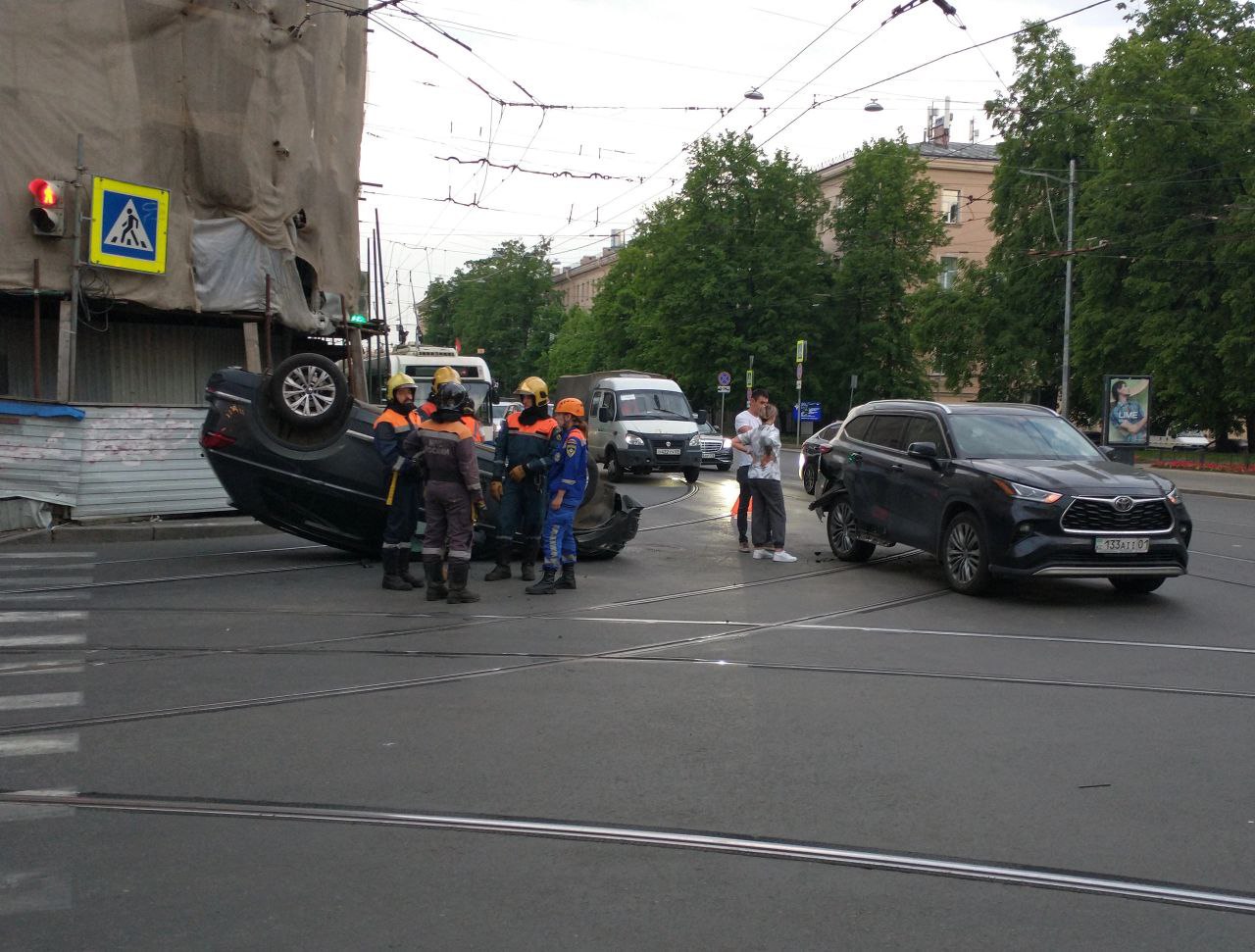 Немецкий кроссовер оказался на крыше после столкновения с чёрной Toyota на перекрёстке улиц Комсомола и Академика Лебедева этим вечером.