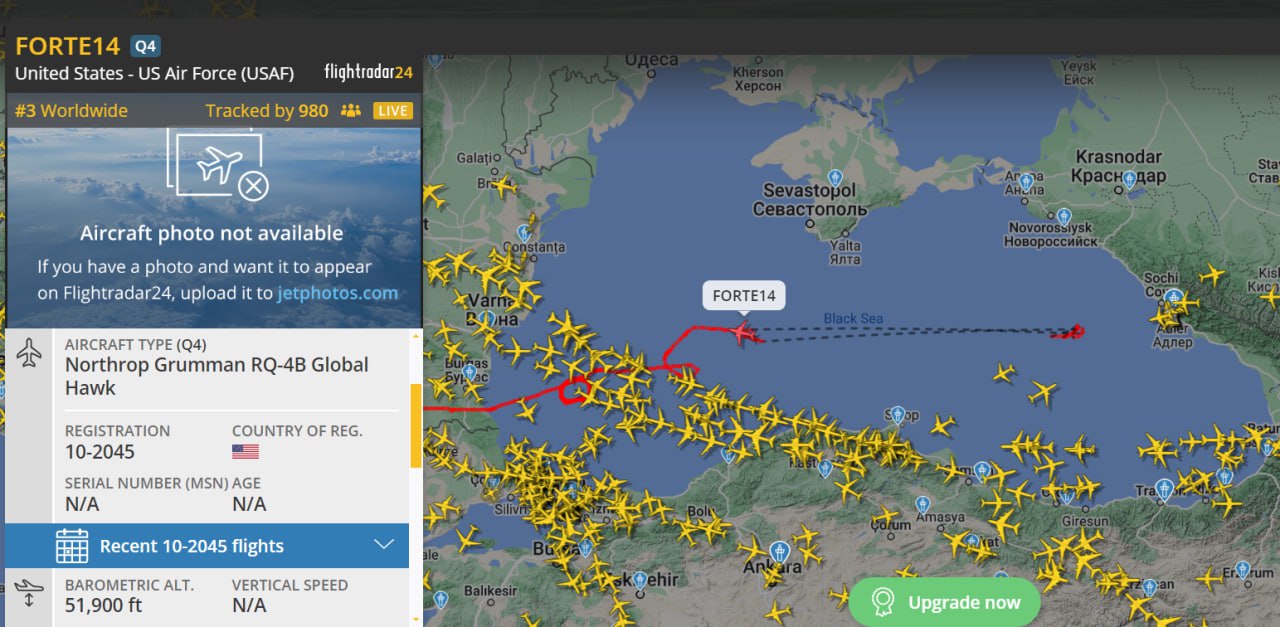 Американский БПЛА RQ-4B Global Hawk сегодня почти весь день работает с отключенным транспондером. Зона мониторинга — южное побережье Крыма и российское побережье в районе Сочи и Новороссийска.