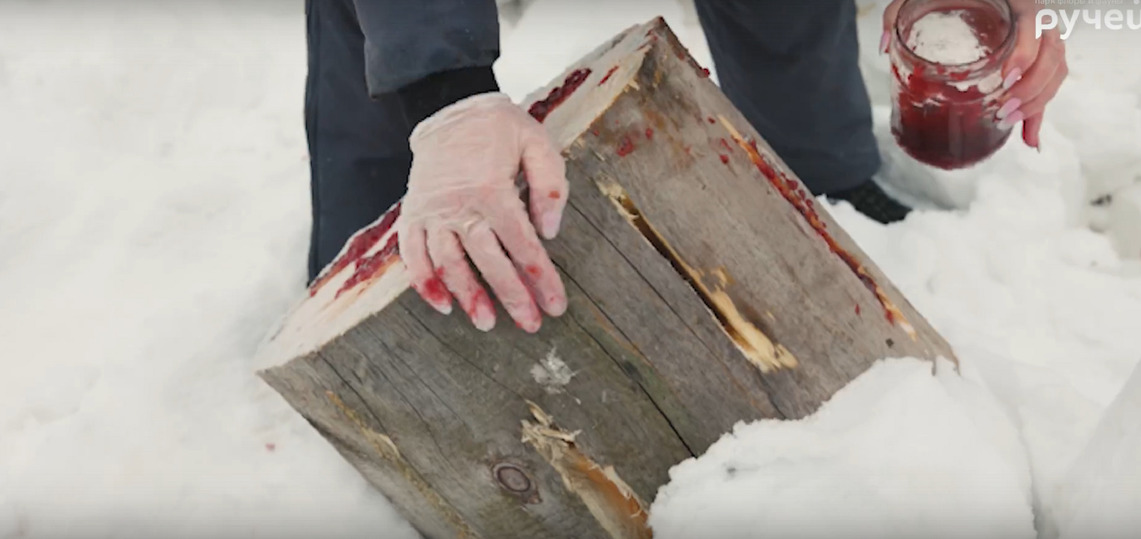 Сотрудники зоопарка решили подбодрить косолапого и дали ему колоду с малиновым вареньем: