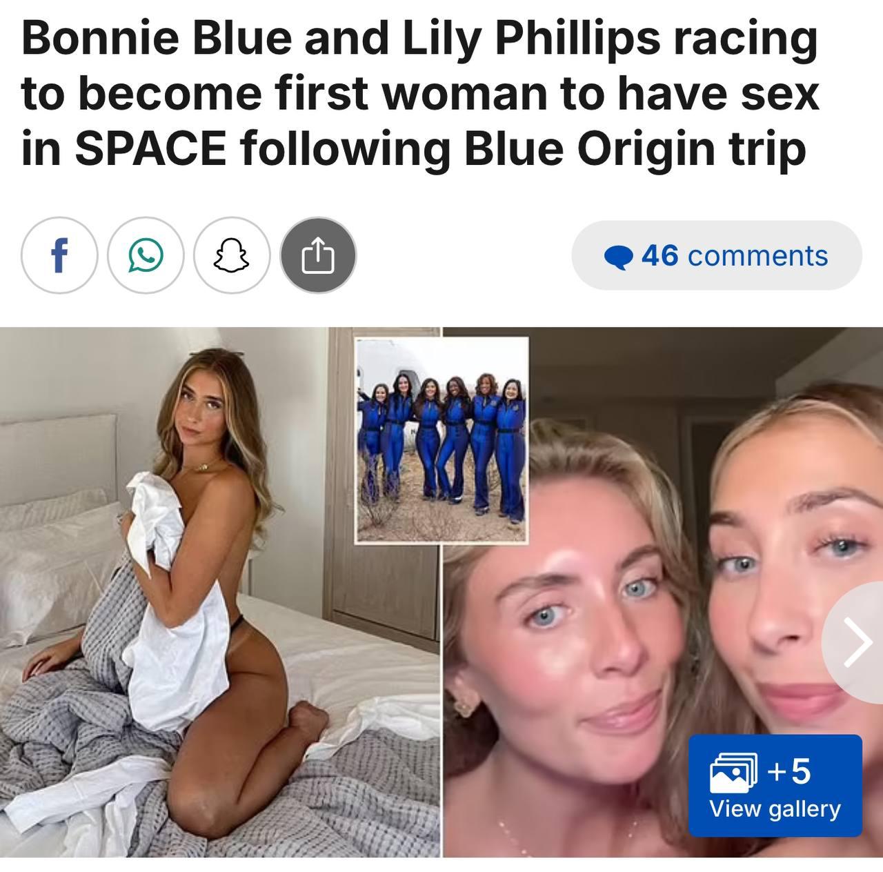 Лили Филлипс и Бонни Блю захотели приблизиться к звёздам в буквальном смысле и устроить галактическое шоу — секс в космосе на туристической ракете Джеффа Безоса. Всё ради любимых подписчиков, которые каждые месяц обеспечивают их стабильными десятью баксами за подписку. Галактический коитус девушки планируют транслировать для своих симпов с Онлифанса.