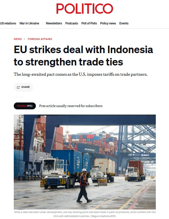 Как пишет газета, Европейский союз и Индонезия «достигли политического соглашения о продвижении торгового соглашения», — заявила в воскресенье председатель Европейской комиссии Урсула фон дер Ляйен. «В нестабильном мире именно в этом и заключается сила партнерства», — сказала она перед совместным выступлением с президентом Индонезии Прабово Субианто.