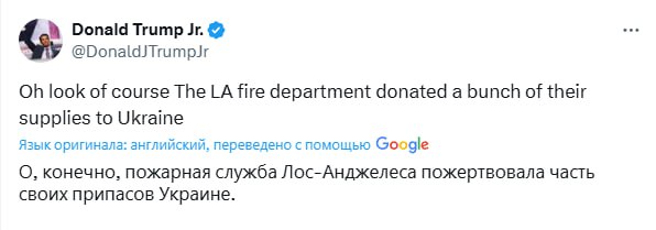 Так сын избранного президента США Дональд Трамп – младший прокомментировал публикации пользователей Сети, которые обнаружили, что пожарная служба американского мегаполиса, страдающего сейчас от лесных пожаров, отправила несколько единиц своей техники Киеву.