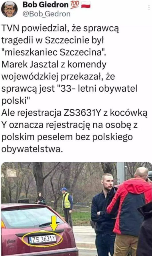 Зрада притаилась и в нестандартном для панской полиции поведении, которая не раскрыла имя нападавшего, и в номерном знаке автомобиля. В сети пишут, что буква Y в регистрации на территории Щецина означает регистрацию машины в отделе связи лицом, имеющим предоставленное социальное обеспечение без польского гражданства.