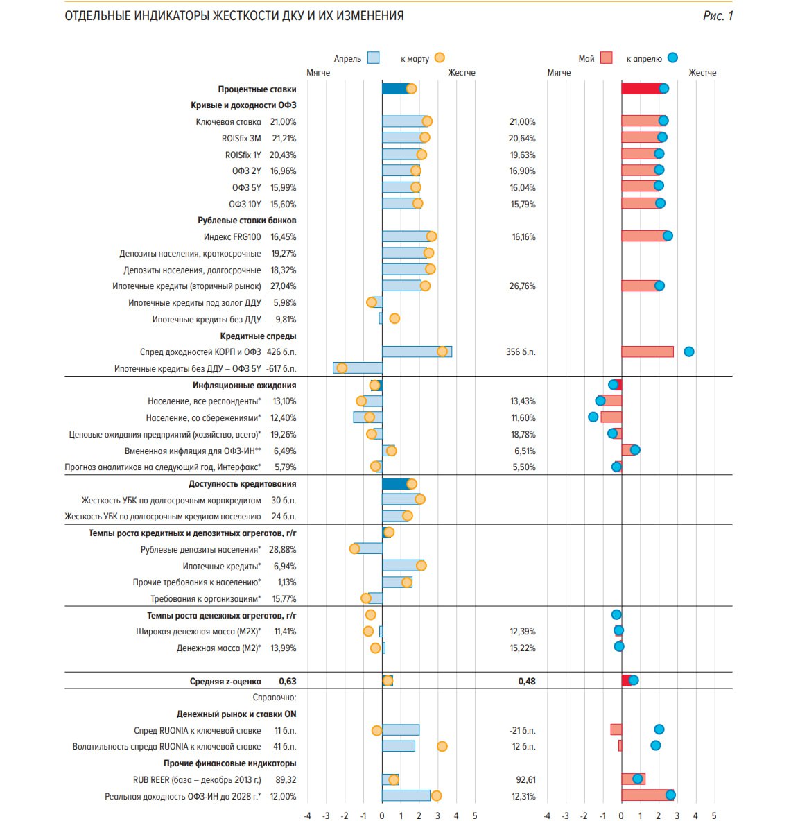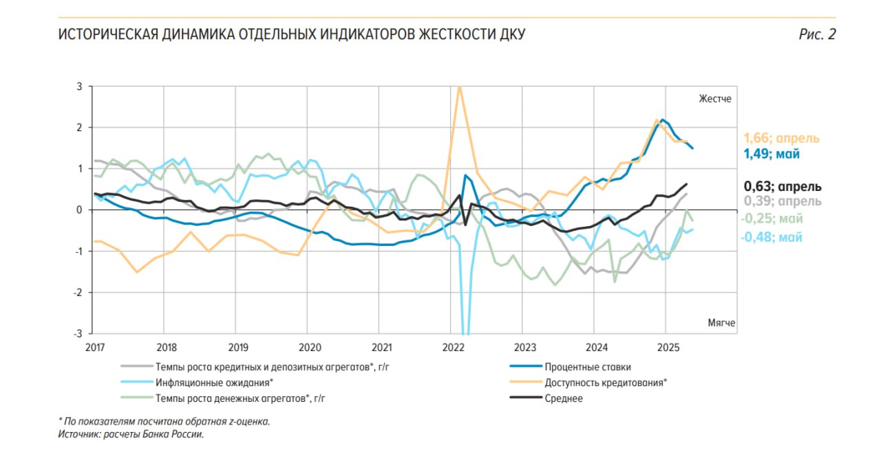 По расчетам ЦБ взвешенный индикатор ДКУ достиг рекордной жесткости, как минимум с 2016 года, что связано с замедлением кредитных и денежных индикаторов при частичной нормализации инфляционных ожиданий при все еще жестких ДКУ.