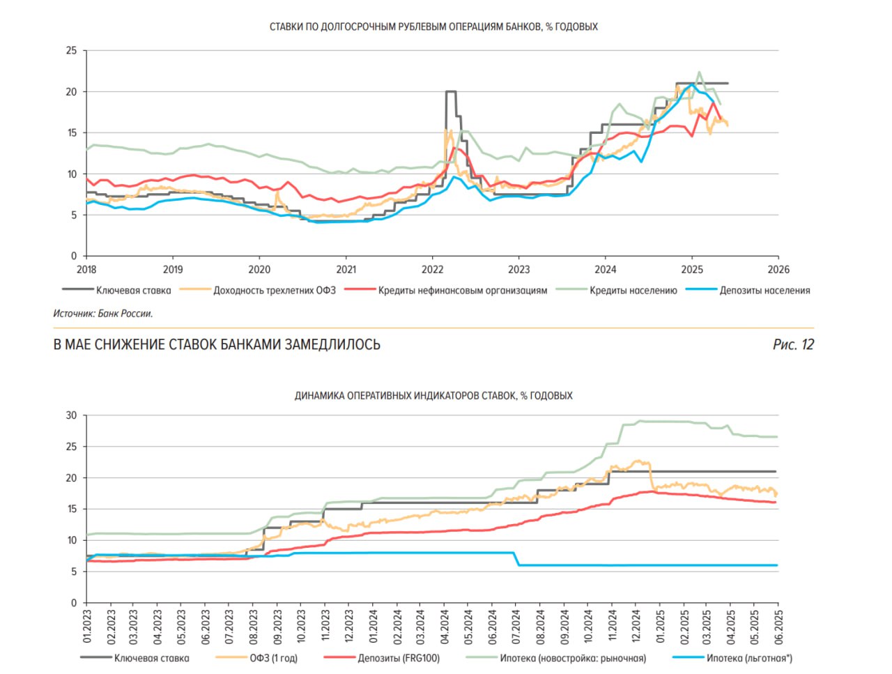 Замедление денежных и кредитных агрегатов, продолжение тренда девалютизации активов на фоне высокой рублевой доходности и инфраструктурных рисков, снижение средневзвешенных ставок по депозитам и кредитам в совокупности со снижением форвардных ставок в диапазон 19-20%, что свидетельствует об ожидании дальнейшего смягчения ДКП.