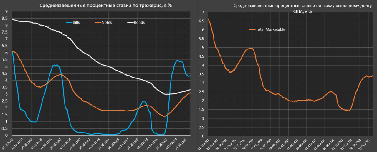 Учитывая, что текущие рыночные ставки по среднесрочным и долгосрочным трежерис сильно выше 3.1-3.3%, - это означает, что по мере рефинансирования существующего госдолга и новых заимствований, средневзвешенные ставки продолжат достаточно ритмичный рост в темпах по 0.034 п.п в месяц по нотам и +0.014 п.п по бондам, а может и выше, если рыночные условия ухудшатся.