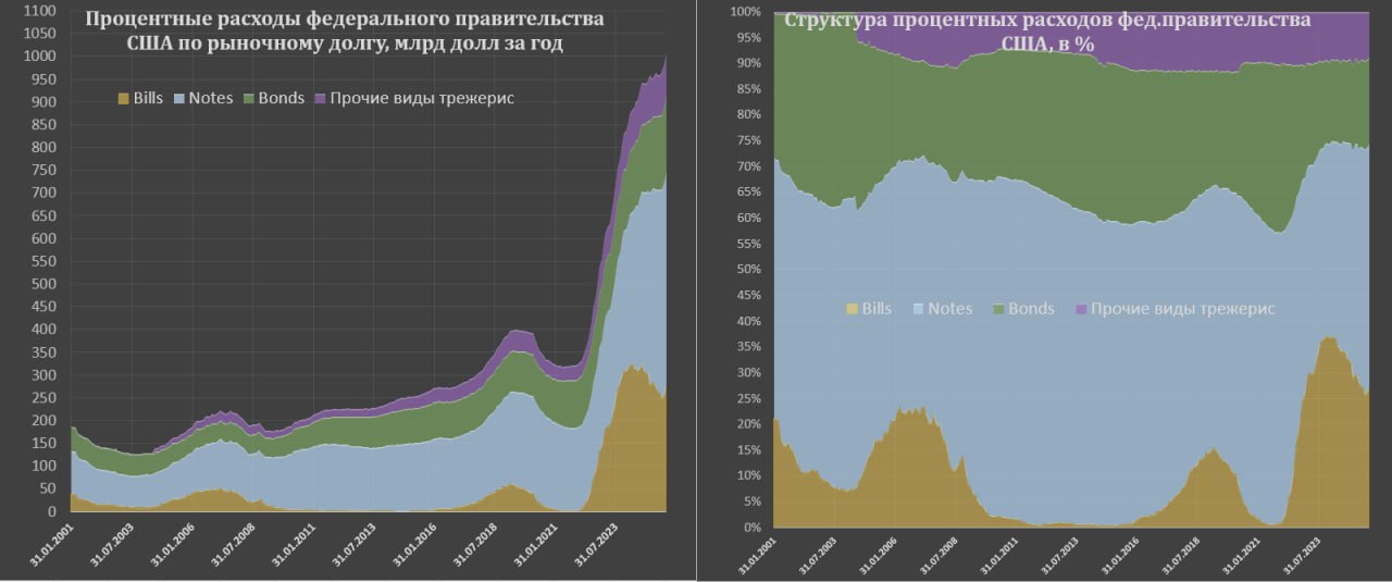 Впервые в истории годовой объем процентных выплат по рыночной части госдолга превысил 1 трлн, где векселя – 276 млрд, ноты – 472 млрд, бонды – 169 млрд, прочие виды трежерис – 88 млрд.