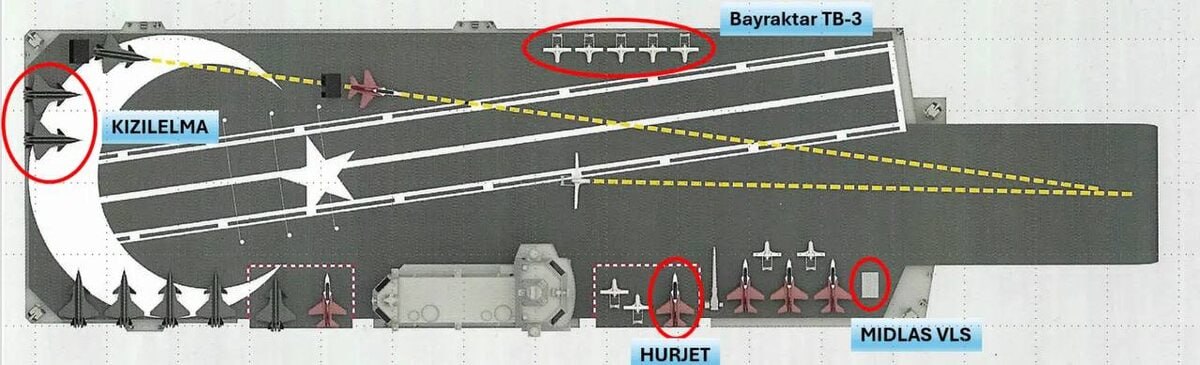 Авианосец будет иметь три взлетно-посадочные полосы — две для взлета и одну для посадки. Первоначально будет построен без катапультной системы, вместо этого будет выбрана модульная рампа. Однако турецкие инженеры уже работают над собственной катапультной системой, которая заменит модульную рампу в будущем. Ожидается, что на авианосце разместятся до 50 самолетов, включая пилотируемые и беспилотные системы. Вместимость авианосца может увеличиться по мере реализации проекта, и переговоры с турецкими оборонными компаниями TAI и Baykar уже ведутся. Авианосец будет вооружен 32-ячеечной (8×4) вертикальной пусковой установкой MIDLAS (VLS) и четырьмя системами ближнего боя Gökdeniz (CIWS). Ещё шесть систем дистанционного оружия Aselsan STOP 25 мм обеспечат оборону ближнего радиуса.