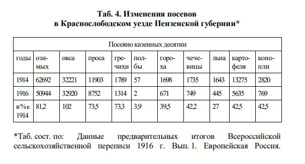 В сборнике приводится статистика по динамике посевов в типичном уезде Великороссии в Пензенской губернии. Хорошо видно, как сильно упали посевы по всем культурам (кроме овса, который требовался для лошадей на фронте).