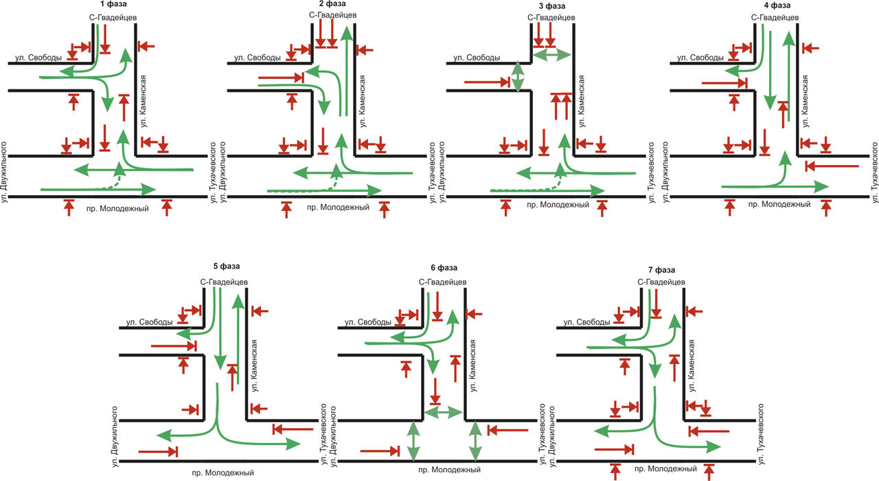 - Вторая фаза – движение транспорта по проспекту Молодежному в обоих направлениях, по улице Каменской от Молодежного в прямом направлении и стрелка налево, по улице Свободы с правым поворотом;
