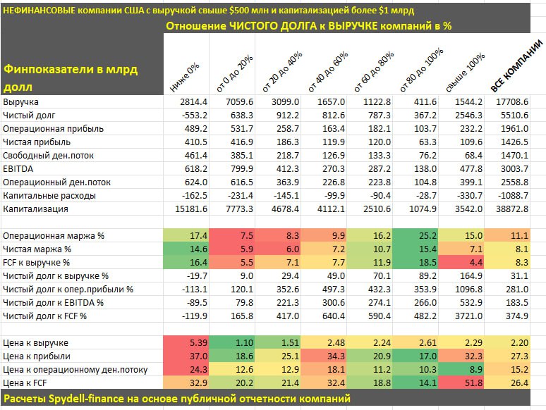 Операционная маржа всех нефинансовых компаний США с выручкой более 500 млн и капитализацией более 1 млрд – составляет 11.1%, но оказывается, что наибольшую маржинальность (25.2%) генерируют компании в группе очень высокой долговой нагрузки (от 80 до 100% чистого долга к выручке), а компании со сверхвысокой долговой нагрузкой (свыше 100%) имеют маржинальность (15%) выше общенациональной (11.1%).