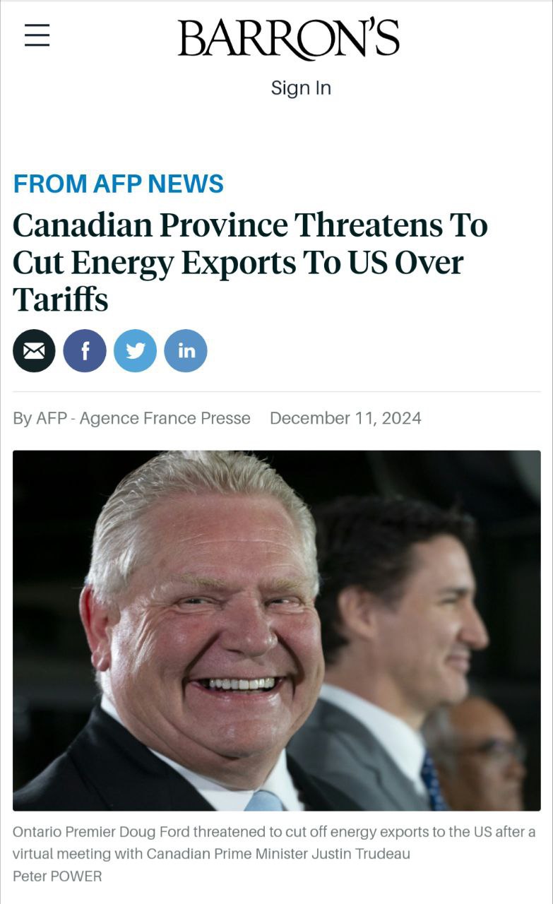 Премьер Онтарио пригрозил прекратить поставки электроэнергии в США из-за возможных пошлин Трампа, пишет канадская газета Barron's