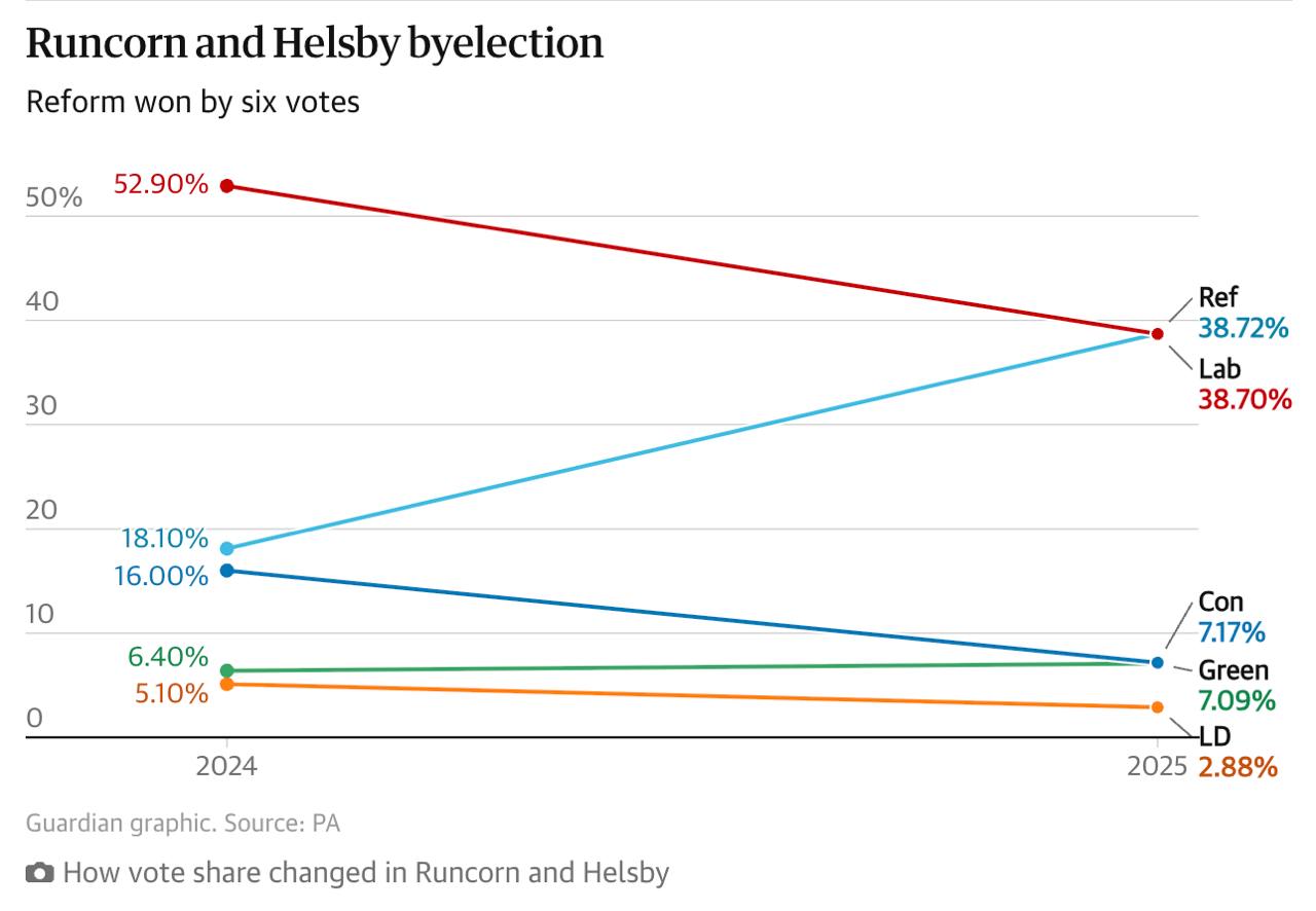 На довыборах в Палату общин в округе Ранкорн и Хелсби кандидат от партии Фараджа занял первое место. Причём он обошёл оппонента от лейбористов всего лишь на 6 голосов. Это один из рабочих округов на севере Англии, который исторически являлся бастионом лейбористов. В 2024 году лейбористы там разгромно победили с 60%. Сейчас же им еле-еле удалось набрать 38%.