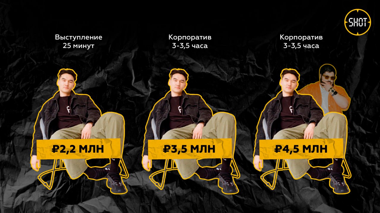 За 25 минут своего времени Нурлан возьмёт ₽2 миллиона при оплате наличными и ₽2,2 миллиона — при оплате на расчётный счёт. Если этого маловато, можно заказать комика в качестве ведущего корпората на три с половиной часа. Но тогда придётся раскошелиться уже на ₽3,5 миллиона. А если доплатить ещё миллиончик — можно получить бонусом дуэт с ещё одной звездой ЧБД — Тамби. Сабуров с Масаевым выступают за ₽4,5 миллиона.