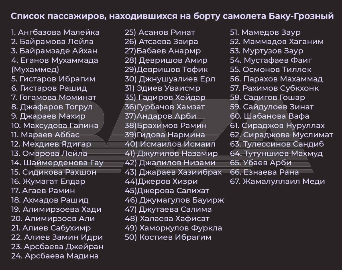 СМИ публикуют полный список пассажиров самолёта, разбившегося в Казахстане
