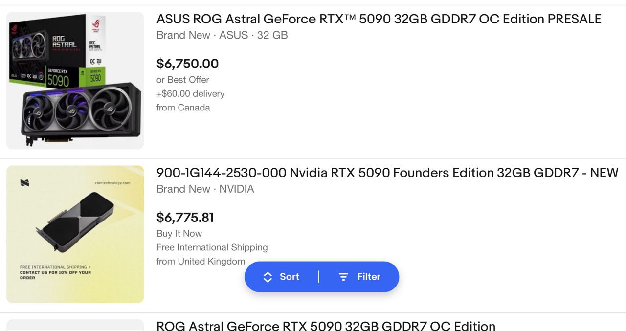 Цена свежей GeForce RTX 5090 взлетела до $6.700: спекулянты перепродают видеокарту на eBay из-за сильного дефицита.