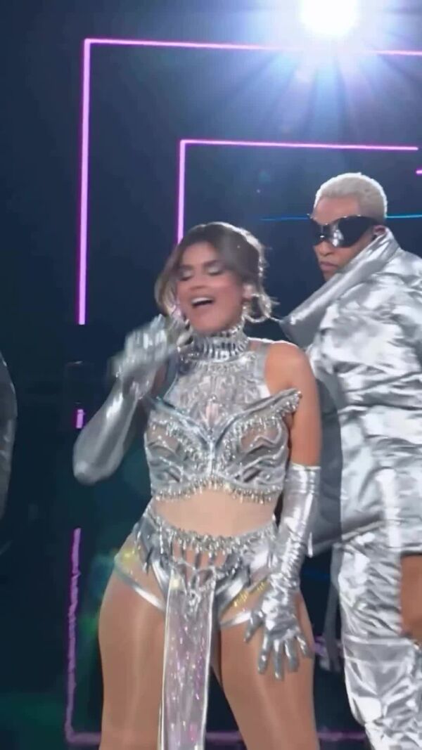 В соцсетях Фуртадо размесила фрагмент из выступления, на котором она спускается по небольшой лестнице к залу. Певицу одели в серебристый костям, закрывающий только грудь и часть бедер. В таком откровенном наряде стали отчетливо видны пышные формы Нелли.