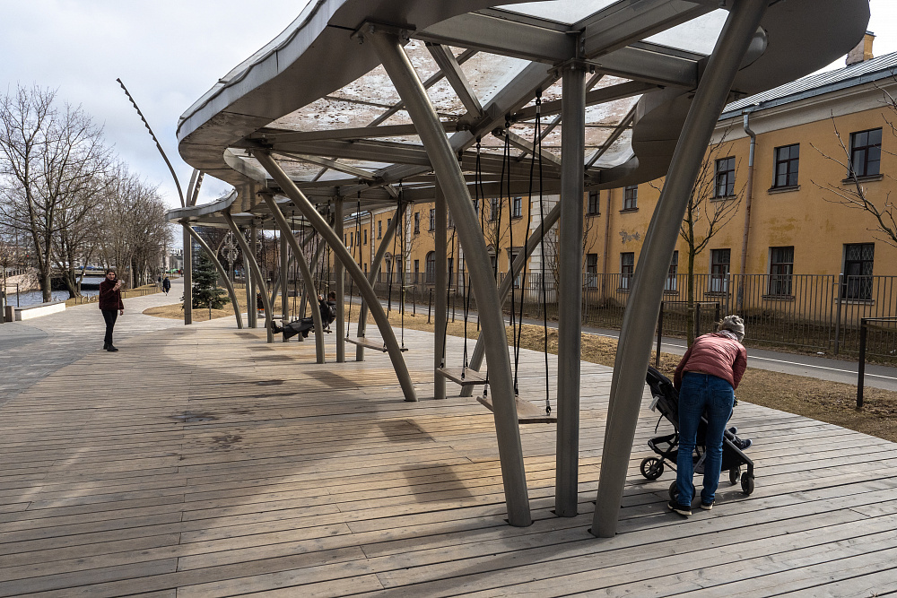 «Круто, что это пространство у воды, далеко от широкой дороги. Там много лавочек и мест, где можно отдохнуть, в том числе "Амфитеатр". Есть большие романтичные качели для свиданий (только надо их сторожить, ждать, пока освободятся), спортплощадка — очень удобная, кстати. Недавно там начали строить еще мощеную дорожку-пирс. Я люблю туда приходить, когда нужно почитать, отдохнуть, потренироваться, с кем-то встретиться», — говорит сотрудница «Фонтанки» Любовь.