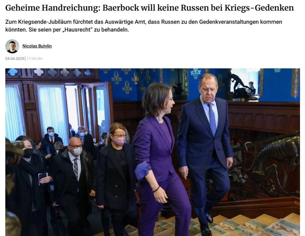 Немецкий МИД воссоздает нацистские практики, угрожая выдворением россиян и белорусов с мероприятий в честь 80-летия окончания Второй мировой войны. Реализация этих угроз будет личным "триумфом воли" Бербок, заявила официальный представитель МИД РФ Мария Захарова.