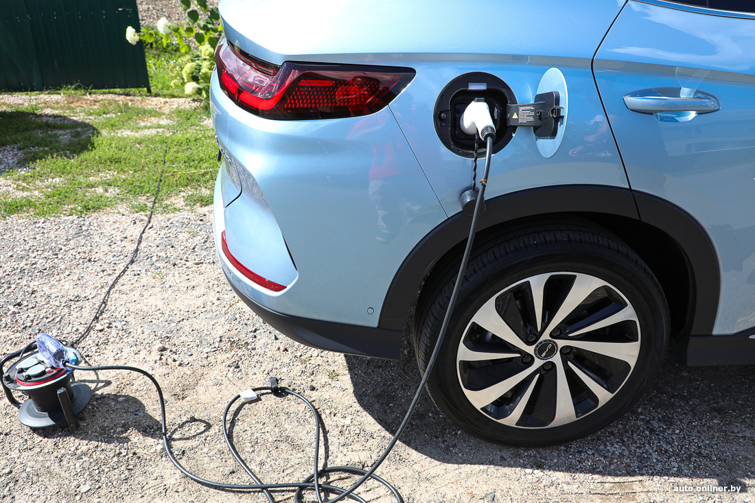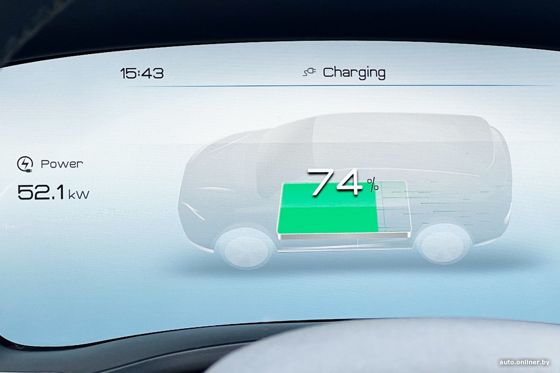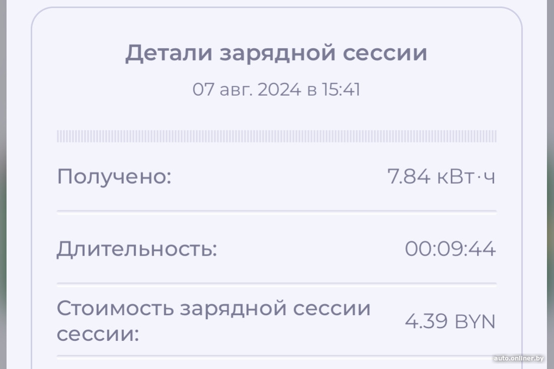 Подъехали к столбику с коннектором GB/T на 50 кВт и менее чем за 10 минут пополнили батарею почти на 8 кВт·ч, что обошлось в 4,39 рубля. Во время зарядной сессии кроссовер стабильно принимал ток мощностью 50 кВт, так что получить запас на 200 км хода можно минут за 40—50 (смотря каким будет расход энергии). Если хотите быстрее, ищите зарядную станцию на 100 кВт и более. Проблема лишь в том, что таких терминалов в Беларуси пока немного.