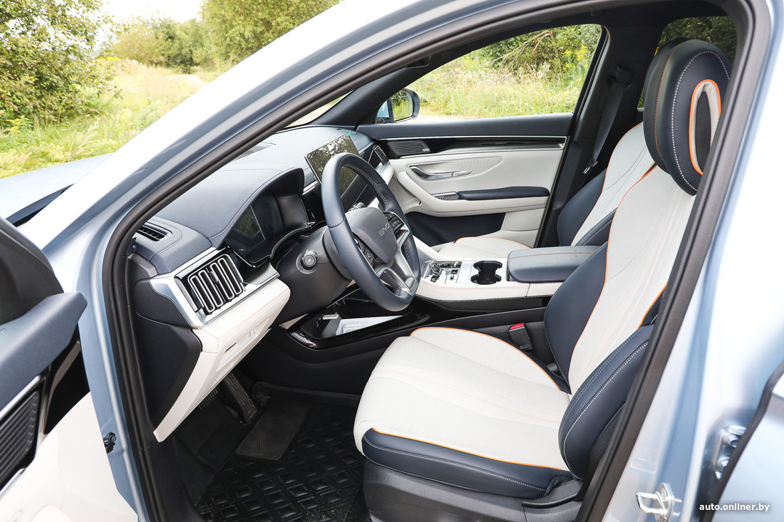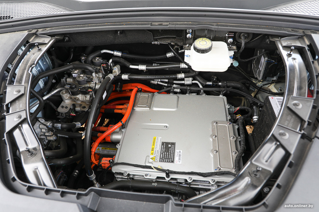 Конечно, ДВС-платформа дает о себе знать: большая батарея не интегрирована в кузов, как, скажем, у более позднего BYD Seal, а просто свисает под днищем. Что, впрочем, не мешает машине иметь дорожный просвет 170 мм. Вот только привод — исключительно передний: один-единственный электромотор вместе с редуктором и силовой электрикой расположен под капотом.
